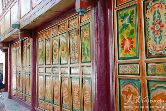 三个民族组成的家庭:张萍妍(最右)的母亲是藏族人,父亲是来自四川的汉族,她和哥哥继承母亲的藏族血统,嫂子则是纳西族。 维西县塔城镇位于云南省迪庆州维西县东北方向,地处世界自然遗产“三江并流”风景名胜区腹心地带。藏族、?僳族、纳西族、彝族、普米族、白族、回族、汉族8种民族在这里生活,和睦相处。这里你能够发现许多由三个以上民族组成的大家庭,各民族在长期的生产生活中,形成塔城古朴、传统、奇特的婚嫁、丧葬等民族习俗和别具风格的饮食文化。 塔城还是唯一承袭完整藏传古典热巴舞的地方,塔城热巴至今仍保持着原始古典的神韵,带有浓厚的藏传佛教色彩,1999年被迪庆州委、州政府命名为“热巴艺术之乡”。(人民网) ![]() 汉语的春联和藏语横批。