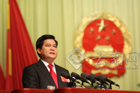 李纪恒作政府工作报告。 记者 杨之辉摄 李纪恒 各位代表: 现在,我代表省人民政府,向大会报告工作,请予审议,并请省政协各位委员提出意见。 一、2012年和第十一届省人民政府工作回顾 刚刚过去的2012年是本届政府履职的最后一年。省人民政府按照省第九次党代会的部署和省十一届人大五次会议确定的目标任务,坚持稳中求进、好中求快、变中求新,攻坚克难、开拓进取,巩固了经济较快发展、社会和谐稳定、民生持续改善的良好局面。重点推进了8个方面的工作: 全力以赴稳增长冲万亿促跨越。狠抓大项目建设,积极争取国家支持,一批重大项目获国家核准。坚持每季度召开一次经济形势分析会,及时研究解决发展中的难题,相继出台了稳增长28条、财税17条、工业跨越发展20条、发展高原特色农业31条等政策措施,加大土地、资金、煤电油气运等保障力度。扎实开展调研督查活动,20个重大建设项目和20项重要工作年度任务全面完成,“三个一百”重点项目建设进度加快。全省经济增速逐季回升,总量跨上1万亿元台阶。 集中力量加快实体经济发展。对全省工业跨越发展、高原特色农业、园区经济、县域经济、民营经济等重点工作进行了部署推进,创新谋划滇中产业新区,全力实施工业发展“3个10千亿工程”,加快六大战略性新兴产业发展。精心策划建设10大历史文化旅游项目,加快推进旅游二次创业,旅游总收入达1702亿元。积极推进节能减排和环境保护。民营经济比重提高到44%。 扩大开放推进桥头堡建设。与国家部委和央企累计签订84份战略合作协议,第一次部际联席会议顺利召开,桥头堡建设总体规划成功获批,中国—南亚博览会落户昆明,中缅油气管道、昆明滇池国际会展中心等一批重大项目开工建设,瑞丽重点开发开放试验区建设起步良好,跨境经济合作区和边境经济合作区建设取得积极进展。成功组织出访大湄公河次区域五国,赴粤、港、澳、沪、苏、浙、津、川、黔等地开展招商引资活动,重视与周边省区市的互利合作,大力推进“央企入滇”、“民企入滇”。成功举办第二十届昆交会等系列活动。 加大力度深化重点领域改革。加强金融改革创新,跨境贸易人民币结算试点等改革取得新成效。积极开展医疗保障制度、国家基本药物制度、基层医疗卫生服务体系、基本公共卫生服务均等化、公立医院改革试点等五项重点改革。教育统筹综合改革、事业单位分类改革、文艺院团体制改革、下放土地供地权改革和开远国家农村改革试验区工作稳步推进,出台丰枯期企业差别电价及居民阶梯电价政策。 扎扎实实做好“三农”工作。抓好强农惠农富农政策落实,切实加大农业农村投入,抗旱减灾有序有力有效。粮食总产量达1827.8万吨、增长4.5%,肉类总产量达540万吨、增长3.5%。特色产业基地和示范园区建设步伐加快,新增经济作物和经济林木700多万亩。新增农业产业化龙头企业90户、农业专业合作社3748个。完成中低产田地改造346万亩,营造林1000万亩以上,新建木本油料基地500万亩以上,实施陡坡地生态治理80万亩。开展1万多个自然村的新农村项目建设。农业总产值达2680亿元、增长7%,大旱之年实现农民增收、农业增效、农村稳定。 破解瓶颈加强基础设施建设。全省在建铁路项目达11项,玉蒙铁路、六沾二线建成运营,铁路投资快速增长;丽江机场高速、石锁高速公路建成通车,18座“索改桥”顺利完工,新开工建设南北大通道3段高速公路;昆明长水国际机场投入运营,泸沽湖机场正式开工,红河、沧源、澜沧机场通过国家审批。新开工建设52件重点水源工程项目,建成山区“五小”水利工程42万件,牛栏江—滇池补水工程有望近期实现试通水。糯扎渡、向家坝、功果桥等水电站一批机组建成投产,水利水电移民得到妥善安置。39个城镇污水和垃圾处理设施投入运行。 统筹兼顾推进区域协调发展。扎实推进民族团结进步边疆繁荣稳定示范区建设,实施新10年农村扶贫开发纲要,民族贫困地区经济发展速度高于全省水平。启动4个集中连片特困地区区域发展与扶贫攻坚,对民族自治地方、边境地区、人口较少民族、散居民族地区和特困民族地区的投入力度不断加大,预计全年减少贫困人口150万人。286万农业转移人口转为城镇居民。大力推进城镇上山工作,低丘缓坡开发利用试点全面开展,新增城乡建设用地规模260.9万亩。 着力抓好保障和改善民生工作。启动实施“居民收入倍增计划”,困难群众的补助标准和收入稳步提高。实施更加积极的就业政策,城镇新增就业29.3万人。加强市场监管,建立价格调节基金,物价保持基本稳定。社会保障实现制度全覆盖。新开工建设31.8万套城镇保障性住房、实施53.3万户农村危房改造及地震安居工程,解决了317万农村人口饮水安全问题,实现村村户户通电。全力以赴抗灾救灾,宁蒗“6?24”、彝良“9?7”等地震抢险救灾取得决定性胜利,恢复重建工作全面展开,完成盈江“3?10”地震第一阶段恢复重建任务。为全省农村义务教育阶段学生实施营养改善计划、为7万多名白内障患者实施免费复明手术等10件惠民实事全部办结。 经过努力,全省生产总值增长13%,规模以上固定资产投资增长27.3%,地方公共财政预算收入增长20.4%,社会消费品零售总额增长18%,城镇居民人均可支配收入增长13.5%,农民人均纯收入增长14.7%,居民消费价格总水