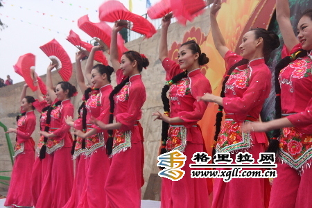 当地群众手拉手跳起纳西族民间舞蹈《阿卡巴拉》。 省花灯剧院的演员们为观众表演精彩节目。