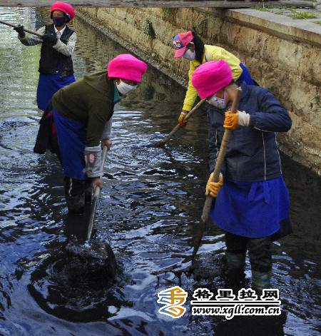 香格里拉县建塘镇诺西村义思村民小组的藏族妇女正在清理龙凤祥至宏达酒店段城市排水河道。据介绍,为畅通城市排水河道,给市民提供清洁的生活环境,香格里拉县有关城建部门组织人员清理城市排水河道。 (张国华 摄影报道)