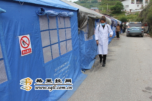 9月4日清早,由香格里拉县社区卫生服务中心临时抽调的此里取追医生,正在为尼西乡枪朵村民小组23户灾民临时安置点喷洒消毒灵。自8月31日以来,该社区医疗服务中心负责三家村、祖母顶、崩顶、吴西龙、打史、克当、祖史7个村民小组的防疫及医疗工作,区域内无疫病发生。(安永鸿) |