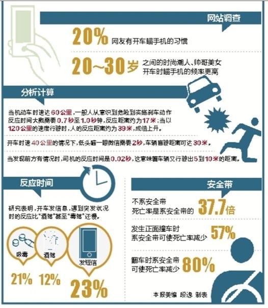 提醒:放下手机 专心驾驶 “微”陋习 “微”陋习主要集中体现在年轻人群中,特别是时尚潮人居多,随时随地刷微博、摇微信,甚至一边开车一边关注手机不断跳出的信息,不停地低头查看。 ![]() “嘀嘀,嘀嘀……”开车途中,手机响了,微信、微博不停更新,怎么办?看还是不看?不少“潮人”都会一边顾着开车一边不停低头瞄手机,看似赶路、谈事两不误,但这些“微”陋习却危害着开车上路的你和其他人,请握好手中的方向盘,放下手机,专心驾驶。 记者走访发现,“微”陋习主要集中在年轻人群中,特别是20岁~30岁之间的时尚潮人、帅哥美女开车时瞄手机的频率更高。而在交警眼中,开车瞄手机和开车打电话一样,会导致驾驶员反应迟钝,后果比酒驾还严重。 惊心 美国女孩开车发微博丧生 此前,被各大媒体频频引述的案例,是英国《每日邮报》的一则报道:美国18岁的女孩泰勒边开车边发微博,发表速度为90秒一条,其中有一条是“边开车边发不安全,哈哈!”谁会想到这竟然成了她的“绝笔”。数秒后,她的车与一辆油罐车追尾,而她也因此丧生。其父母要求政府立法禁止开车发微博,以此来警诫世人。 目前,我国针对开车接打电话明确了记2分、罚款50元,瞄微信、刷微博可被判定为妨碍安全行车行为,一旦被查也将受罚。 分析 低头2秒盲驶超过30米 与拨打、接听电话不同,看微博、瞄微信时老驾低头注视手机屏幕,比开车打电话更危险。记者与几位交警进行了分析计算,当“时尚潮人”开车时速40公里的情况下,低头瞄一眼微信需要2秒,车辆盲驶距离可达30米。 记者试了一下,从拿起手机打开微信,到浏览一条新信息,眼睛至少要在屏幕定格2秒左右,如果车辆分别按时速20公里、60公里行驶,1秒钟就要跑5.6米和16.7米,从低头再到抬头,最快也要2秒,当发现前方有情况时,司机的反应时间是0.02秒,照此算下来,车辆又要行驶出5到10米,这个距离在驾驶中是很可怕的。而浏览一条信息大约需要10秒,这短短的10秒钟,却足以让多人丧命。 也许有人觉得,反正自己车开得不快,技术也好,瞄微信、刷微博就是小意思,大不了瞄一眼就回来、多瞄几次才看完。但交警也提醒,每一次的事故是谁也不能预料到的,一旦发生事故,不但严重影响交通秩序,来来往往那么多车辆,受到危害的也绝不仅仅只是司机一个人。 苦恼 见到微陋习交警取证难 昨天下午2点半左右,记者就在弥勒寺路口看到了一位边开车边打电话的老驾。老驾开车一辆白色丰田轿车,透过车窗玻璃可以很清楚地看他正在打手机,就在交警准备上前的瞬间,老驾抬起头,立马将手机扔到了副驾驶座上。交警告诉记者,许多驾驶员开车打电话、看短信,看到交警立即将手机藏起,大多不承认自己有违法行为。而往往因为打手机、看微信等引发交通事故后,驾驶员也都不会承认自己肇事是因为有明显违法,而违法行为发生在肇事之前,很难及时取证。“执勤时有时确实看到了,可因为很多打电话都是瞬间的事,也存在难取证的问题。”交警说。 提醒 珍爱生命开车时放下手机 很多东西都是有瘾的,“微”爱好也只有在开车时会变成陋习,如果是在闲暇时倒也无所谓。开车非比寻常,千万不要不拿生命当回事。就像大家常说的,你不要命别人还要命呢。提醒每一位时尚潮人,为了自己及大家的安全,开车的时候请改掉“微”陋习,珍爱生命,若有需要接听的电话或查看重要信息时,把车停靠在路边后再接听、回复。(春城晚报) |