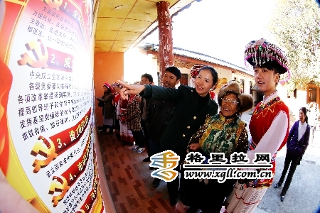 ![]() 香格里拉网讯 (通讯员 熊子军 马飞) 12月4日上午,香格里拉县上江乡木高村村委会大院内人潮涌动,100多名藏族、傈僳族、纳西族党员干部和群众自发前来听退伍战士唐春媛为他们讲解党的十八届三中全会精神。唐春媛用藏语、傈僳语、纳西语和当地方言为他们讲解。 唐春媛退伍前是14集团军某炮兵旅的一名藏族女兵,是旅里出了名的理论学习标兵和业余讲解员。11月底,旅里组织退伍老兵学习党的十八届三中全会精神时,她萌发了把十八届三中全会精神带回家,用自己掌握的汉、藏、傈僳、纳西四种语言给家乡的少数民族群众宣讲改革政策的念头。 在退伍前的几天时间里,唐春媛一有空就上网、逛书店、做展板,四处搜集关于十八届三中全会精神的资料,边学习、边理解、边翻译注释,忙得不亦乐乎。为了提高回家宣讲的质量,离队前她还特意在连队连续试讲了三次,主动请部队领导和战友给她提意见和建议,并结合自身实际对宣讲内容进行了完善和改进。 “今天唐春媛讲得很好,我们欢迎更多像她一样的义务宣讲员到木高村,给我们宣讲党的十八届三中全会精神。”木高村党员余荣杰说。 |