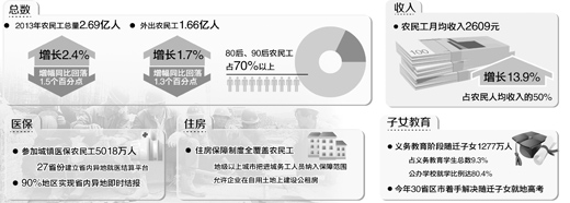制图:宋嵩 总量已达2.69亿人 国务院农民工工作领导小组办公室主任、人力资源和社会保障部副部长杨志明2月20日在国新办发布会上透露,到去年底,我国农民工总量已达2.69亿人,其中外出的农民工1.66亿人;农民工月均收入2609元,增长13.9%,农民工收入占到农民人均收入的50%,其中中西部地区务工收入比东部地区一般低10%左右;80后、90后新生代农民工,已经占到农民工的70%以上。 杨志明强调,我国农民工总量供大于求的现象仍然存在,但农民工供给增速放缓。去年农民工总量增长了2.4%,但同比增幅回落了1.5个百分点。其中外出农民工增长了1.7%,但同比增幅也回落了1.3个百分点。从区域分布来看,东部地区比上年减少了0.2%,中部地区增长了9.4%,西部地区增长了3.3%。春节后一些城市和企业不同程度地出现的招工难,反映了我国农业劳动力随着多年的大规模持续转移已不再是一个取之不尽的蓄水池,农民工就业正从总量的压力为主向结构性矛盾突出转变。 分区域看,东部地区仍然是农民工就业多的地方,占60%以上,但开始出现了低增长甚至是负增长。尽管中西部地区务工收入比东部地区一般低10%左右,但由于离家较近、生活成本低、便于照顾家庭等因素,使得中西部地区就业的吸引力不断增强。杨志明认为,这顺应了产业升级和产业转移的需要,促进了东中西部之间农民工的合理流动。 杨志明表示,解决招工难、就业难问题,政府有关部门正从以下几个方面加大力度。一是实施农民工技能提升计划,每年培训1000万人,到2020年,使新生代农民工都能够得到一次政府补贴的就业技能培训。二是大力发展农民工就业容量大的第三产业、中小企业和劳动密集型产业。三是扶持农民工返乡创业。“目前,经过进城务工的磨炼和自我积累,有点技能、有点资金、有点营销意识、有点办厂能力和对农村有感情的返乡创业‘五有’农民工已经有200多万人。”杨志明说,“如果说把海外留学生回国创业称之为‘海归’,也可以把这些农民工返乡创业称之为‘城归’。从现在返乡创业的情况来看,他们多数都搞了家庭农场,成了专业大户。” 随迁子女达1277万人 住房和城乡建设部住房保障司副司长张学勤表示,解决农民工的住房困难,要坚持“两条腿”走路。一方面还是要坚持市场化的方向,鼓励有一定支付能力的农民工根据自身需要在市场上租房或者买房。另一方面是强化政府乃至企业的责任,给老百姓,特别是给农民工提供保障性住房。 张学勤介绍,去年国务院已经明确要求,地级以上城市要把进城务工人员纳入住房保障范围。目前最适合于农民工居住特点的保障房品种是公租房,下一步要在住房保障制度上做到全覆盖。此外,住建部正要求地方各级政府改善城乡结合部等农民工聚集地的基础设施条件、公共服务环境。对于城中村或者棚户区的改造,住建部要求地方结合农民工的特点,配建一定比例的保障房。住建部同时允许农民工比较集中的工业园区集中建设农民工公寓或农民工宿舍,也允许一部分企业在自用土地上建设一定比例的公租房。 教育问题也是农民工非常关心的问题。教育部基础教育一司副司长杜柯伟介绍,以公办学校为主接收随迁子女就学的格局已经基本形成。截至2013年年底,全国义务教育阶段的随迁子女一共是1277万人,占到义务教育学生总数的9.3%。在公办学校就学的比例,2013年达到了80.4%,比2012年略有提升。除了在公办学校就读以外,上海、浙江一些地方还采取由政府向民办学校购买学额的方式,共有39万在民办学校就读的学生享受了政府购买学额的服务。国家财政性教育经费保障随迁子女就学的比例已经达到了83.5%。 义务教育之外,农民工家庭还普遍关心异地中高考的改革进展。杜柯伟说,2013年异地高考破冰,12个省市组织实施了随迁子女在当地参加高考。2014年18个省区市开始解决,“所以到今年全国会有30个省区市着手解决随迁子女在当地参加高考的问题”。 5018万人参加城镇医保 异地参保困扰着很多进城务工的农民。国家卫生计生委流动人口计划生育服务管理司司长王谦介绍,我国的新农合参合人数在2013年达到了8.02亿,参合率99%。尽管参合率很高,但由于60%的农民工是流动的,他们面临异地就医和医疗费结算的难题。 王谦介绍说,就省内而言,2013年90%的统筹地区实现了新农合经办机构与省内异地医疗机构的即时结报,61%的统筹地区实现了新农合省内异地就医“一卡通”。就跨省而言,国家的新农合信息平台已经与9个省和一些大型的医疗机构联通。同时,各地也在积极探索农民工跨省就医的即时结报。比如,在淮海经济区以徐州市为医疗机构中心,周边涉及江苏、山东、河南、安徽8个市58个县的新农合经办机构,与徐州市的12家医疗机构签订了相关服务协议,实现了计算机联网和现场刷卡结报,覆盖了5000万参合农民。下一步卫计委还将加快国家新农合信息系统平台的建设,至少可推动50%以上的省份实现与国家新农合信息平台的联通。 杨志明表示,在城镇与企业建立稳定的劳动关系、签了劳动合同的农民工,要依法推进其参加城镇职工医疗保险。去年参加城镇医保的农民工达到了5018万人,其中参加城镇职工医保的农民工达到4667万人。当前城镇基本医疗保险已经基本实现了市级统筹,正在向省内联网结算推进。全国已经有27个省份建立了省内异地就医结算