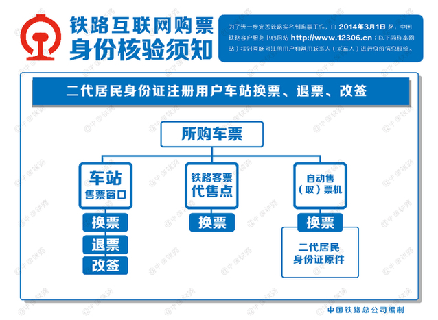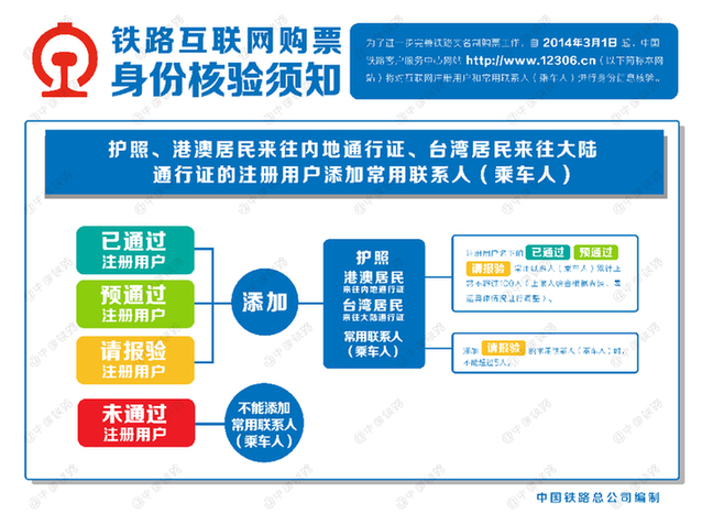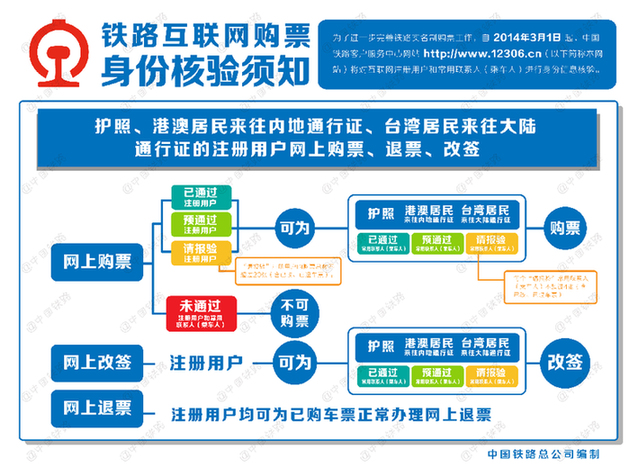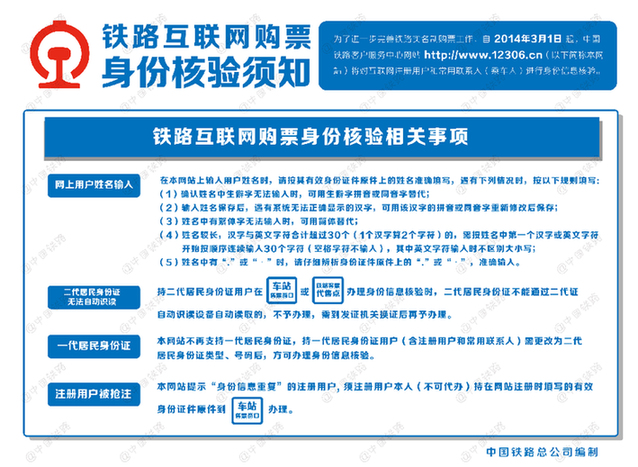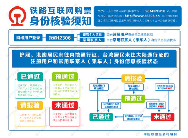 记者从中国铁路总公司获悉,为了进一步完善铁路实名制购票工作,从2014年3月1日起,12306网站将对互联网购票进行身份信息核验。 实施身份信息核验后,在12306网站上使用二代居民身份证的注册用户和常用联系人身份信息将有“已通过”“待核验”“未通过”三种核验状态,使用护照、港澳居民来往内地通行证、台湾居民来往大陆通行证的注册用户和常用联系人身份信息将有“已通过”“请报验”“预通过”“未通过”四种核验状态。身份信息核验状态为“已通过”“预通过”的注册用户和常用联系人,可在12306网站正常办理购票业务;其它状态的注册用户和常用联系人需要确认在12306网站所填信息的正确性,或持相关证件原件到车站窗口或代售点办理身份信息核验。 在实施身份信息核验的同时,12306网站将对旅客办理网上购票、退票、改签,网购车票在车站办理换票、退票、改签,以及注册用户添加常用联系人(乘车人)等功能进行完善。 在车站窗口以及代售点购票仍执行既有的实名制购票规定。 铁路互联网购票身份信息核验问答 1.铁路部门为什么要实施互联网购票身份信息核验? 答:根据铁路实名制购票有关规定,票、证、人一致方可购票乘车。同时,为了有效打击利用12306网站进行囤票、倒票的违法行为,维护广大旅客的合法权益,铁路部门通过国家身份认证权威部门对注册用户和常用联系人(乘车人)进行身份信息核验。 2.实施互联网购票身份信息核验后,车站窗口和代售点购票有何变化? 答:这次实施身份信息核验只限于通过12306网站购票的旅客,旅客到车站窗口和代售点购票仍然按原规定办理。 3.铁路互联网购票身份信息核验包括哪些证件? 答:铁路互联网购票身份信息核验包括在有效期内的二代身份证,按规定可以使用的护照、港澳居民来往内地通行证和台湾居民来往大陆通行证。实施身份信息核验后,12306网站不再支持一代身份证和其它证件。持一代身份证用户需更改为二代身份证后方可办理信息核验。
