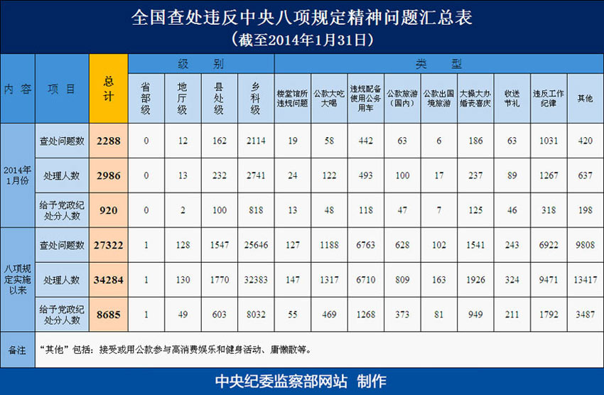 中央纪委监察部网站今日一早发布2014年1月全国查处违反中央八项规定精神问题汇总情况。 截至2014年1月31日,全国查处违反中央八项规定精神问题2288起,处理2986人,给予党纪政纪处分920人。 据悉,为掌握全国贯彻落实八项规定精神情况,中央纪委在31个省区市和新疆生产建设兵团、60个中央和国家机关建立了落实中央八项规定精神情况月报制度。(新华网) 全国查处违反中央八项规定精神问题情况如下: