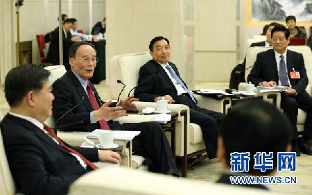 3月9日,中共中央政治局常委、中央纪委书记王岐山参加十二届全国人大二次会议陕西代表团的审议。 王岐山在陕西代表团参加审议。在听取赵正永、娄勤俭、燕君芳等代表发言后,王岐山表示,完全赞成张德江委员长所作的全国人大常委会工作报告。他强调,要按照习近平总书记在中央纪委三次全会上提出的要求,形成领导干部不想腐、不能腐、不敢腐的有效机制。面对当前依然严峻复杂的反腐败形势,要把遏制腐败蔓延势头作为重要任务,以零容忍态度惩治腐败,形成有力震慑,营造不敢腐的氛围。要全面深化改革,加快体制机制创新,实现国家治理体系和治理能力现代化;推进依法治国,完善党纪党规和法律法规,把制度的篱笆扎得更紧;加强党内监督、群众监督和舆论监督,严肃纪律、强化管理,完善激励约束机制,使之不能腐。最终要靠坚定理想信念,增强宗旨意识,使领导干部不想腐。王岐山希望陕西全面深化改革,实现三秦大地山川秀美、和谐发展。 |