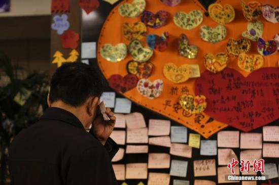 4月1日,家属在祈祷室内的祈祷墙前。当日,马来西亚代表团在北京丽都饭店与马航MH370航班乘客家属就机上卫星电话是否存在呼出的问题进行沟通。熊然 摄