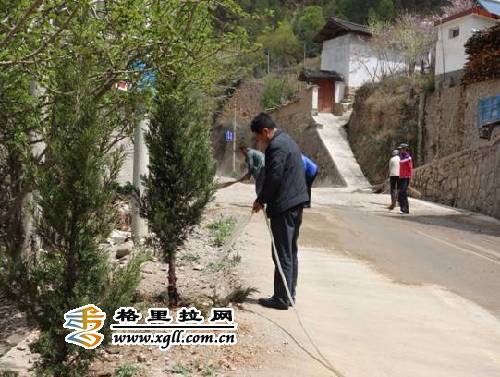 25日,维西县中路乡佳禾村“千促”工作组与村民一起打扫路面垃圾,并为绿化树浇水。(杨洪程摄)