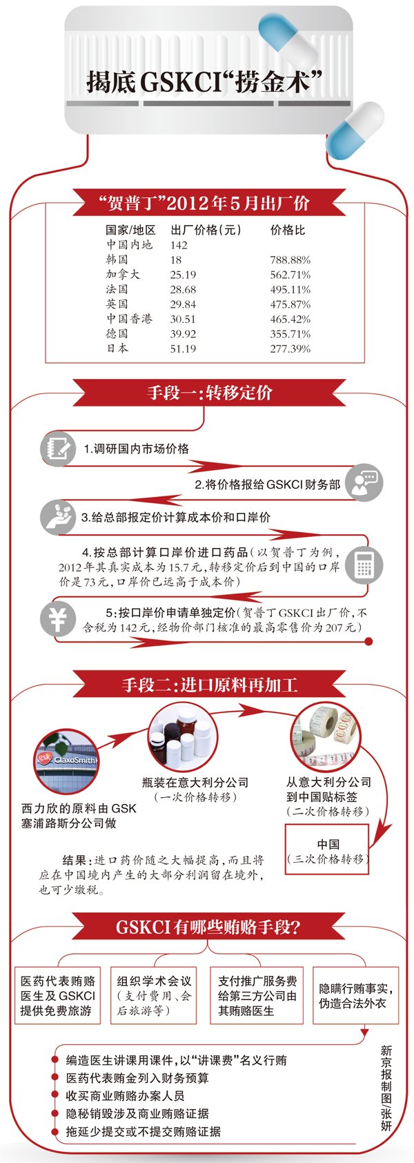 昨日,湖南省长沙市公安局发布消息,历经十个多月的侦办,葛兰素史克(中国)投资有限公司(下简称GSKCI)涉嫌对非国家工作人员行贿、单位行贿、对单位行贿等案已侦查终结,于日前依法移送检察机关审查起诉。 据介绍,GSKCI在中国销售的药品大多冠以海外原研药名义,在药品进口前通过转移定价的方式,增高药品报关价格,在将巨额利润预提在境外的基础上,设定高额销售成本用于支撑贿赂资金。 GSKCI药品的价格远高于在其他国家的价格,最高的达到其他国家的7倍。GSKCI能够将真实成本仅10余元的药品,在中国卖出10倍以上的高价,实现数以亿计的销售收入;但销售收入逐年飙升的同时,却是微利甚至亏损。 葛兰素史克中国公司高管指认,该公司从2009年开始,调整销售策略,涉嫌用金钱贿赂开道,提高销量。另外,该公司为应对工商部门调查,成立专门危机公关小组,采取涉嫌商业贿赂的方式拉拢工商人员,意图逃避处罚或减轻处罚。 昨日下午,葛兰素史克(中国)方面在发给新京报记者的邮件中引述“葛兰素史克公司发言人”的表述称,“今天我们与公安部进行了会面,其间他们向我们通报了调查的进展,我们非常严肃地对待这些指控。这让我们非常担心,它们违背了葛兰素史克的价值观。公司将继续就此案全力配合政府相关部门。” 招数1 “转移定价” 同一药品中国内地出厂价是韩国七倍 新康泰克、芬必得、贺普丁……提起GSKCI旗下的“明星”药品,中国老百姓十分熟悉;它们在中国高昂的定价,也令人印象深刻。 记者从有关方面获得的一份2012年5月GSK《专利药品(含专利过期药品)境外市场价格填报表》中,清晰地反映了这一点。 以知名药品贺普丁为例,在中国的出厂价是142元人民币,而在韩国只有18元,在加拿大不到26元,在英国不到30元,在德国、日本及中国香港等国家和地区,其出厂价也远远低于中国内地。这并非个例。GSK的另一种药品贺维力也呈现同样的情况:相较于日本的103.5元和中国香港的59.92元,它在中国内地的出厂价高达182元。 GSKCI的药品价格为何如此之高?价格又是如何确定的? 多名涉案的GSKCI高管供述,新药进口到中国前,大多冠以海外原研药名义,在药品进口前通过转移定价的方式,增高药品报关价格,将巨额利润预提在境外。 犯罪嫌疑人、GSKCI原副总裁兼疫苗部总经理陈洪波说,这是跨国公司实现利润最大化的一种主要方法。在原产国分公司把要赚的利润确定好,把确定后的(原产国)零售价作为销往另一个国家分公司的成本价。在这个基础上,再实行一套价格策略,确保在另一个国家能够盈利。 “对GSKCI而言,除了进口成品药,还有一种方式是进口原料再加工。”陈洪波供述,西力欣的原料由GSK在塞浦路斯的分公司做,瓶装是在意大利分公司,从塞浦路斯到意大利进行一次价格转移;从意大利分公司到中国贴标签,再进行一次价格转移。多次价格转移之后,每个分公司都赚钱,总利润相当可观。 犯罪嫌疑人、GSKCI副总裁兼企业运营总经理梁宏在供述中称,GSKCI的这种做法不仅大幅提高进口药品价格、获取巨额利润,而且将应当在中国境内产生的大部分利润留在境外,达到少缴税的目的。 因此,GSKCI财务报表上的数据也就不难理解——2009年至2012年,公司主营业务收入约为39.78亿元、48.62亿元、55.29亿元、69.75亿元;而同期的营业利润约为1.09亿元、﹣0.47亿元、0.6亿元、﹣1.88亿元。 “值得注意的还有主营业务成本,与主营业务收入一样,也呈逐年猛增之势。”侦办GSKCI案件的专案组民警介绍,2009年至2012年,公司主营业务成本(进货成本)分别约为30.39亿元、37.13亿元、43.16亿元和50.3亿元,这其中就包含通过转移定价预留在境外的利润。 以贺普丁为例,2012年,贺普丁真实成本为15.7元,转移定价后到中国GSKCI工厂的口岸价是73元,GSKCI出厂价(不含税)为142元,经物价部门核准的最高零售价为207元。 除了通过“转移定价”把利润留在国外之外,GSKCI还在国内进行了另一次“价格转移”,其报关进口虚高价格的药品后,通过其设在中国的工厂加工包装出售给GSKCI。在这部分“价格转移”中,不仅实现了其中国工厂的利润,也通过GSKCI药品出厂价与GSKCI中国工厂出厂价中间的差价,预提了在中国的贿赂销售费用和目标利润。由此可见,把虚高价格的药品卖出去是GSKCI的最大目标,表面上看GSKCI微利或亏损,实际上卖得越多赚得越多。 |