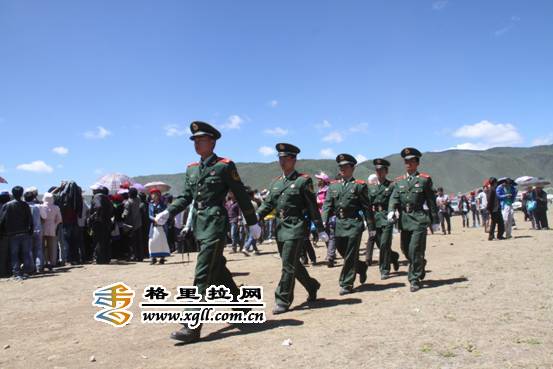 香格里拉五月赛马节期间,武警云南总队迪庆支队近百名官兵放弃节日,执勤在拉咱坝赛马场一线,以良好的形象赢得了广泛赞誉。(王文涛摄)