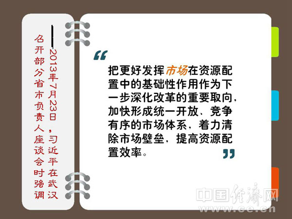 要把更好发挥市场在资源配置中的基础性作用作为下一步深化改革的重要取向,加快形成统一开放、竞争有序的市场体系,着力清除市场壁垒,提高资源配置效率。 ——2013年7月23日习近平在武汉召开部分省市负责人座谈会时强调 解读:清除阻碍市场有效运转的壁垒 市场壁垒是市场经济的障碍,行业垄断则是公平竞争的天敌。 在市场壁垒中,对市场竞争危害最大的是体制性壁垒或行政壁垒,它们往往通过许可证制度、核发执照、原材料管制等方式,限制新企业的进入。以民营医院为例,虽然政府有关部门有明确的政策规定,但民营医院很难进入医保定点范围,其医务人员在专业技术职称晋升、学术交流等方面,也受到卫生行政部门和学术团体的忽视甚至歧视。一些行业由于满足于这种行政壁垒带来的好处而形成路径依赖,根本没有想到或不愿意形成以竞争为导向的行业企业优势,导致规模经济、客户忠诚度、绝对成本优势、产品差别化等都无从体现。 与之相对应的行业垄断,主要是一些国企特别是央企的行政性垄断(其中不排除有先天的资源垄断因素),其行为主要有订立协议固定价格、限制产量、划分市场和滥用市场支配地位等。建设公平竞争的市场体系就要消除壁垒、打破垄断。 只有消除壁垒、打破垄断,才能公平竞争,让各行各业充满生机活力;企业只有公平参与市场竞争,才能有源源不断的动力追求技术进步、产品创新,为经济转型提供“源头活水”。