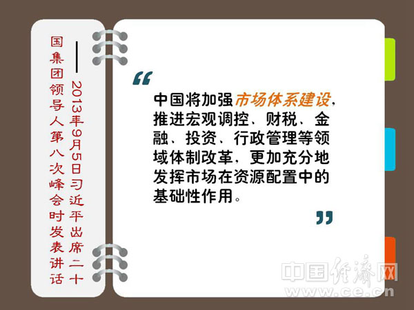 中国将加强市场体系建设,推进宏观调控、财税、金融、投资、行政管理等领域体制改革,更加充分地发挥市场在资源配置中的基础性作用。 ——2013年9月5日习近平出席二十国集团领导人第八次峰会时发表讲话 解读:建设完善的现代市场体系 建立社会主义经济体制,必须培育发展一个统一、开放、竞争、有序的市场体系。市场体系是市场制度构成的首要部分,是包含要素市场以及由要素市场衍生而来的各类市场的有机统一体。市场机制在市场主客体以及市场时空上发生有效作用,必须以统一开放、竞争有序的市场体系为前提。主要应在以下几方面着力: 第一,坚持把建立公平、开放、透明的市场规则作为加快完善现代市场体系的前提。公平、开放、透明的规则体系的建立,将有效约束市场主体行为,反对垄断,制止不正当竞争,规范各类市场运行,维护市场秩序,保障市场体系竞争有序。 第二,坚持把完善主要由市场决定价格的机制作为加快完善现代市场体系的关键。灵活的价格机制是市场有效配置资源的基础,只要“主要由市场决定价格的机制”还没有完全确立,我们的市场体系就不能称之为完善的现代市场体系。 第三,坚持把深化要素市场改革作为加快完善现代市场体系的主攻方向。要素市场是我国市场体系培育与建设的薄弱环节,要素市场化进程远远落后于商品市场化进程。当前,加快完善现代市场体系,必须把要素市场的培育与建设作为主攻方向,其中尤其要将城乡统一的建设用地市场和金融市场体系的建设和完善作为重中之重。