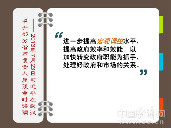 进一步提高宏观调控水平,提高政府效率和效能。以加快转变政府职能为抓手,处理好政府和市场的关系。 ——2013年7月23日习近平在武汉召开部分省市负责人座谈会时强调 解读:提高政府的宏观调控和治理水平 充分发挥市场在资源配置中的决定性作用,绝不是说政府无所作为,而是应坚持有所为、有所不为,着力提高宏观调控和科学管理的水平。 宏观调控的手段和方式多种多样,除了传统的财政政策、金融政策、投资政策、消费政策等,还有宏观规划、收入分配、社会游说、行业自律、技术标准等。无论是传统的还是其他宏观调控手段,重点在于保障经济稳定增长,完善基本公共服务均等化,建立新型的收入分配制度,提高人们的生活水平和全社会的福利水平。 发挥政府宏观调控作用,就要求进一步转变政府职能和提高透明度。政府宏观调控应当从当前无所不包、无所不管的状态中解放出来,健全科学的宏观管理体制与方法,改革计划、投资、财政、金融等专业职能部门的管理体制,将非政府职能转移到行业组织等市场中介机构,政府的职能主要是统筹规划、制定政策、组织协调、提供服务、监管市场。 许多市场经济国家普遍是“小政府大市场”。“小政府”是指进一步明晰政府职能,不缺位、不错位、不越位。提高透明度,既能够促进政府部门完善服务职能,也能够引导生产者和消费者的市场行为,保障行业协会等市场中介组织有效运转,最终有效地发挥政府宏观调控作用。