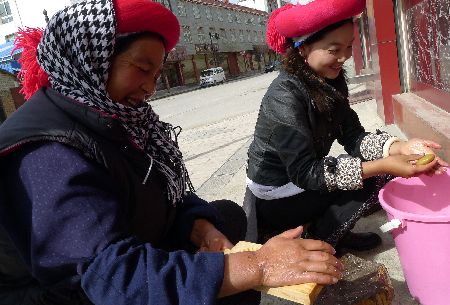 2月10日中午,香格里拉县建塘镇从古龙村民卓玛和她的大女儿正在制作饼子迎接新春佳节。据了解,香格里拉县城周边的藏族村落都有打春饼迎新年的传统习惯。 (张国华 摄影报道)