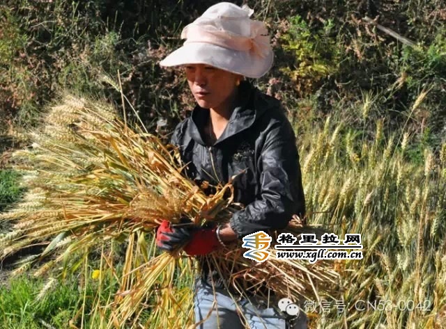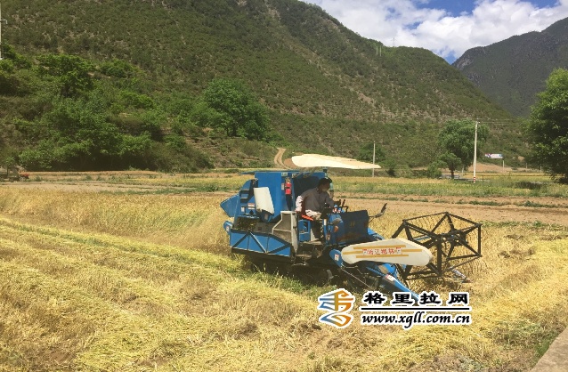 维西塔城村民收割小麦。近日,维西县塔城镇贾木谷村民忙碌着收割小麦,目前,该村村民用一体化收割机收割小麦,提高了农民的劳动效率,节约了劳动力。(张国华 摄)
