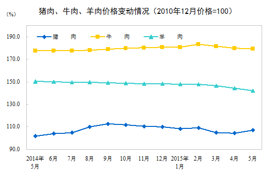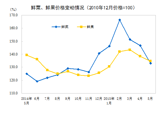 2015年5月份,全国居民消费价格总水平同比上涨1.2%。其中,城市上涨1.3%,农村上涨1.0%;食品价格上涨1.6%,非食品价格上涨1.0%;消费品价格上涨0.9%,服务价格上涨2.1%。1-5月平均,全国居民消费价格总水平比去年同期上涨1.3%。 5月份,全国居民消费价格总水平环比下降0.2%。其中,城市下降0.2%,农村下降0.1%;食品价格下降0.9%,非食品价格上涨0.2%;消费品价格下降0.3%,服务价格上涨0.1%。