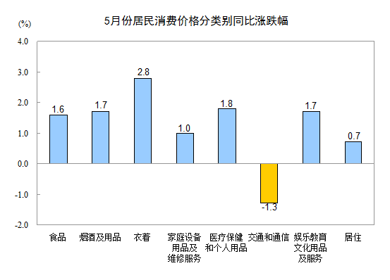 5月份,非食品价格同比上涨1.0%。其中,衣着、医疗保健和个人用品、烟酒及用品、娱乐教育文化用品及服务、家庭设备用品及维修服务、居住价格分别上涨2.8%、1.8%、1.7%、1.7%、1.0%和0.7%;交通和通信价格下降1.3%。 据测算,在5月份1.2%的居民消费价格总水平同比涨幅中,去年价格上涨的翘尾因素约为0.7个百分点,新涨价因素约为0.5个百分点。