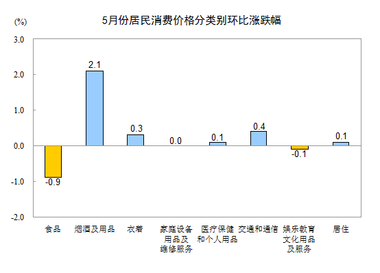 二、各类商品及服务价格环比变动情况 5月份,食品价格环比下降0.9%,影响居民消费价格总水平下降约0.31个百分点。其中,鲜菜价格下降9.2%,影响居民消费价格总水平下降约0.31个百分点;鲜果价格下降2.7%,影响居民消费价格总水平下降约0.07个百分点。肉禽及其制品价格上涨0.8%,影响居民消费价格总水平上涨约0.06个百分点(猪肉价格上涨2.7%,影响居民消费价格上涨约0.08个百分点)。 5月份,非食品价格环比上涨0.2%。烟酒及用品、交通和通信、衣着、医疗保健和个人用品、居住价格分别上涨2.1%、0.4%、0.3%、0.1%和0.1%;娱乐教育文化用品及服务价格下降0.1%;家庭设备用品及维修服务价格持平。