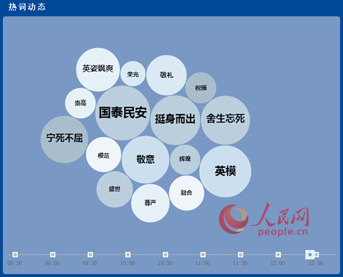 图为网民实时关注地图截图 纪念中国人民抗日战争暨世界反法西斯战争胜利70周年大阅兵今天在北京天安门广场隆重举行。人民网联合人民在线、新浪微博数据中心、微博热点、哈尔滨工业大学社会计算和信息检索中心联合发布大数据策划“网民情绪展示”。该策划利用大数据手段,采集今天8:30至12:30这四个小时内网民在新浪微博平台上的阅兵相关话题进行分析统计。 图为舆情走势截图 该策划共采集网民有关阅兵的原创微博及转发微博总帖量为453万人次。数据显示,网民参与发帖的峰值点出现在中午12:00,峰值数据为50万人次。 哪里人最爱微博聊阅兵? 广东北京山东人居前三甲 图为发帖量最大的地区排行榜 (注:右边数据为热度计算值,非实际发帖量) 数据显示,广东、北京、山东的网民最爱微博聊阅兵话题,其他位居排行榜前十位的地区还有江苏、浙江、四川、上海、河南、福建、湖北。 网民怎么聊阅兵? 高频词:国泰民安、挺身而出、舍生忘死 图为热门高频词截图。 阅兵激发了广大网民的爱国热情,“致敬、荣光、威武、永恒、雄壮、祝福、风范、尊严、正义、喝彩、瞩目、和平、铭记、繁荣昌盛、团结一心、舍生忘死、英姿飒爽、国泰民安”……网民们用他们能够想到的最美好的词语来描述观看阅兵仪式的感慨和激动。 图为十大热点话题排行榜(注:右边数据为热度计算值,非实际发帖量) 整个阅兵过程威武雄壮,高潮迭起。人民网大数据策划“网民情绪展示”中,登上十大热点话题排行榜的话题分别是:“习近平宣布将裁军30万”、“9.3天安门阅兵”、“向老兵致以最崇高的敬意!”、“抗日战争胜利纪念日”、“抗日战争胜利纪念日,缅怀先烈,祭奠同胞!”、“今天,无论你在何处,请为阅兵喝彩,为中国点赞!”、“今天,大阅兵!此刻,一起传递!庆祝胜利!分享荣光!”、“英姿飒爽!看中国军人风采!”、“这一刻,美丽的天安门广场”、“装备方队正整齐入场”。(人民网 记者盛卉) |