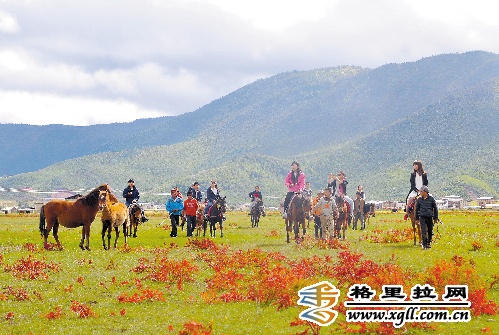 国庆期间,香格里拉成了众多国内外游客的首选目的地。图为游客正在纳帕海畔的依拉草原上骑马游玩,金黄的草原、火红的狼毒、宁静的藏族村落构成了一幅幅天然美景。