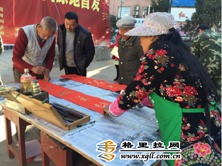 书法爱好者现场挥毫泼墨为群众免费写春联。
