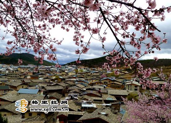 艳丽的桃花与独克宗古城寺庙的金顶交相辉映。