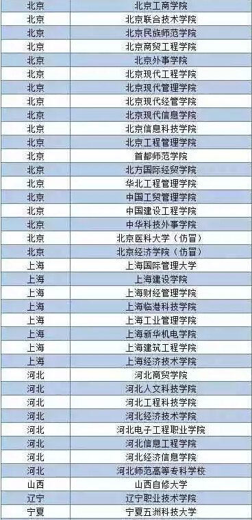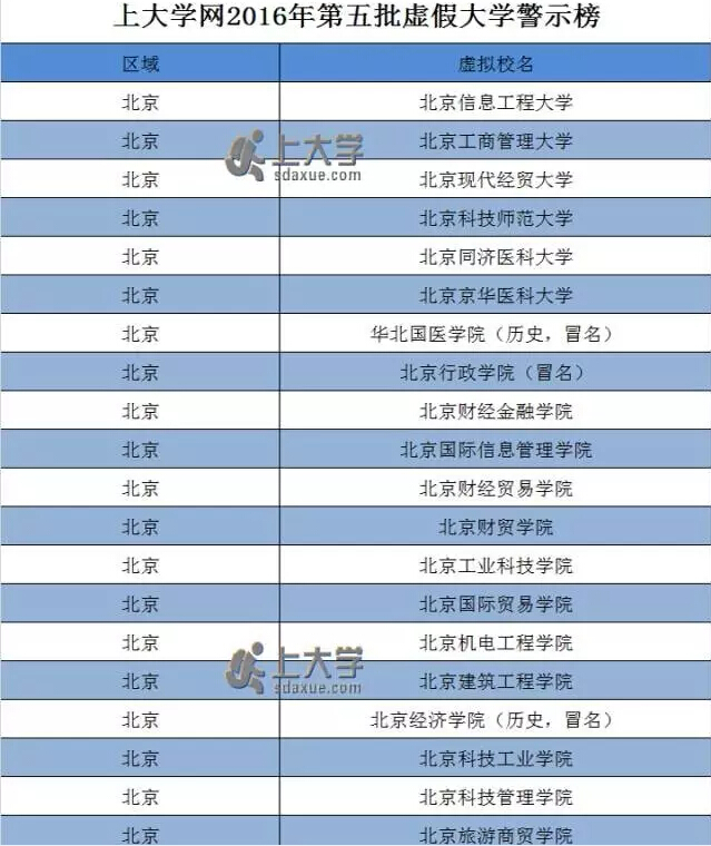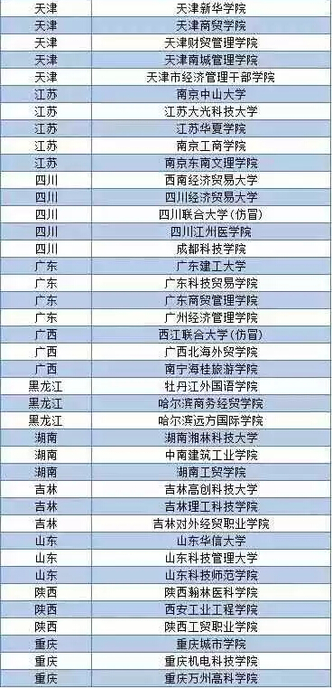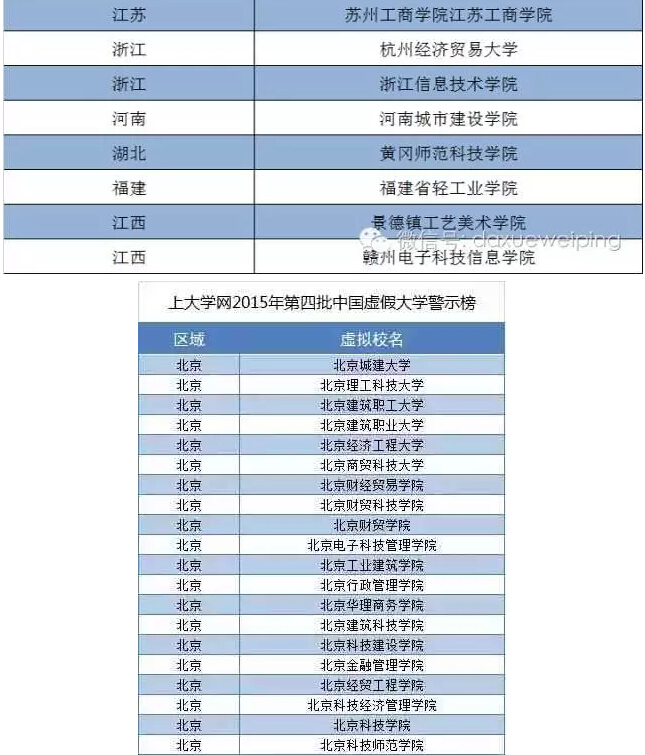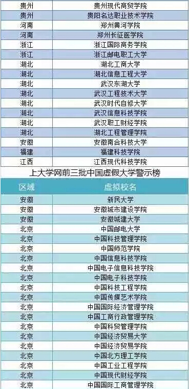 近日,上大学网公布了第五批《中国虚假大学警示榜》,这次共有73所虚假大学被曝光,福建新增一个黑名单-福建省轻工业学院。 自此,福建省已经被曝光5所虚假大学: 福建省轻工业学院、福建海峡经贸技术学院、福建经济贸易大学、厦门师范学院、福建科技学院。 识别虚假大学小技巧: ①虚假大学均不在教育部最新公布的“2015年全国高等学校名单”中②虚假大学的校大都仿冒正规普通高等院校或其他正规学校③虚假大学的自建学校网站不在工信部备案或盗用其他实体单位的备案信息④虚假大学网站的IP地址(空间/服务器)大都挂靠大陆以外的地区或国家⑤虚假大学大多抄袭或盗用正规学校的简介、校园新闻或图片等内容⑥虚假大学自建学校网站均有在线学历查询入口,但查询结果只是该校学籍数据库不被教育部承认以下是到目前为止上大学曝光的400多所虚假大学完整名单
