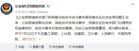 ![]() 据公安部治安管理局暨打四黑除四害专项行动办公室官方微博消息,近来,公安部接到群众反映,因姓名中含有冷僻字,持身份证在有关部门办理相关权益事务时,姓名冷僻字识读存在障碍。对此公安部高度重视,即与群众联系,并于7月22日下午召集工信部、人社部、住建部、卫计委、人民银行、中国民用航空局、中国铁路总公司等7个部委有关业务主管部门,推动姓名中含有冷僻字身份证在各用证部门特别是基层窗口单位全面正常使用。 为解决办理户籍和居民身份证有关业务中遇到的姓名冷僻字等问题,公安部从2004年持续开展全面深入调研,不断收集整理户籍登记信息中使用的冷僻字5000余个,组织研发公安人口信息管理系统冷僻字统一解决方案,建立了公安人口信息库专用字库,并推动各用证部门完善有关识别系统。2011年国家发布新修订的《信息技术通用多八位编码字符集(UCS)》标准后,公安部立即下发通知,对公安人口信息管理系统冷僻字解决方案进行全面升级,实现了对国家标准的全覆盖。目前,升级后的系统已收录汉字数量达到7.2万余个,最大限度满足群众办理户籍和身份证业务的需求。 今年以来,公安部会同国家民委、教育部、工信部等14个部委联合发布《关于在政府管理部门和社会公共服务信息中统一姓名采集应用规范的通知》, 进一步推动社会各用证部门 按照“在信息系统的设计研发工作中 ,要实现对国家标准编码汉字GB18030或GB13000的全覆盖”的要求,加快信息系统升级改造,确保居民身份证的有效识读和相关业务的正常办理。 与会各部门表示,要结合实际抓紧推进业务信息系统字库升级工作,即便在字库没有完成升级的情况下,也要保证公民使用姓名中含冷僻字的身份证办理相关事务时没有限制、正常办理。从方便群众自身工作生活考虑,与会各部门也建议为新生儿起名时尽量使用常用规范汉字,减少因姓名含冷僻字带来的不便。(人民网)