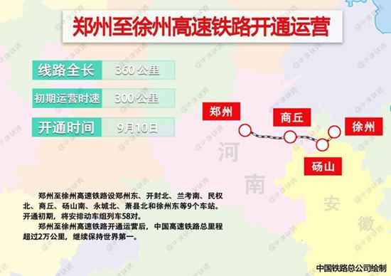 人民网北京9月10日电(李楠楠)记者从中国铁路总公司获悉,9月10日,郑州至徐州高速铁路开通运营。 郑州至徐州高速铁路自河南省郑州市起,经开封、商丘,安徽省砀山、萧县,至江苏省徐州市,全长360公里,设郑州东、开封北、兰考南、民权北、商丘、砀山南、永城北、萧县北和徐州东等9个车站,初期运营时速300公里。 郑州至徐州高速铁路于2012年12月开工建设,2016年4月开始联调联试。开通初期,将安排动车组列车58对。郑州至上海最快列车的运行时间由原来的6小时47分缩短至约4小时,西安至上海最快列车的运行时间由原来的10小时47分缩短至约6小时。 郑州至徐州高速铁路是国家中长期铁路网规划的高速铁路陆桥通道重要组成部分,该铁路与已运营的郑西高铁、西宝高铁、兰新高铁和在建的宝兰高铁,共同构成新的高标准、大能力欧亚大陆桥运输通道,对于发挥铁路在推进“一带一路”建设中的服务保障作用具有重要意义。该铁路建成通车后,将大大缩短我国西部地区与中东部地区的时空距离,并连通已运营的京沪高铁和京广高铁,使我国高速铁路网进一步完善,对于发挥高铁成网优势具有十分重要的作用。 郑州至徐州高速铁路开通运营后,中国高速铁路总里程超过2万公里,继续保持世界第一。 |