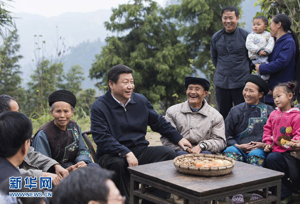2013年11月3日至5日,中共中央总书记、国家主席、中央军委主席习近平在湖南考察。这是3日下午,习近平在湘西土家族苗族自治州花垣县排碧乡十八洞村同村干部和村民座谈。 会外到会内,习近平的十八洞村情缘 2016年两会,习近平同人大代表湖南湘西土家族苗族自治州州长郭建群交流时,十分关心十八洞村的情况,连连追问“现在人均收入有多少了”“去年有多少人娶媳妇儿”,他说,“我正式提出‘精准扶贫’就是在十八洞村”。 习近平所说的是他2013年11月的湖南之行。那次考察,他翻山越岭来到十八洞村,看到这里全是“996138部队”,也就是老人、孩子、妇女,认为扶贫必须“实事求是,因地制宜”,郑重提出“要精准扶贫,切忌喊口号,也不要定好高骛远的目标”,他对乡亲们说,“还是给你们搞‘几条腿’来吧——一户养几头黑猪、一头黄牛,再养几只山羊,这总能办得成”。老太太、老大爷听了很高兴,说“就要这个”。 此后,“精准扶贫”成为扶贫工作的重要指导思想,两年多后,习近平在全国两会上追问“娶媳妇儿”,实际上是要看“精准扶贫”的进展和成效,而“娶媳妇儿”正是一个“精准”切口。 这几年,扶贫工作也一直是习近平在全国两会上关注的重点,在贵州、广西等许多代表团,他都有针对性地了解情况,提出要求。 在黑龙江代表团,听到赫哲族代表刘蕾介绍赫哲族群众生活的变化,习近平关心地问,现在还有多少人靠打鱼为生、江里的鱼还多不多。他强调,人数较少民族也都要奔小康,一个也不能少。