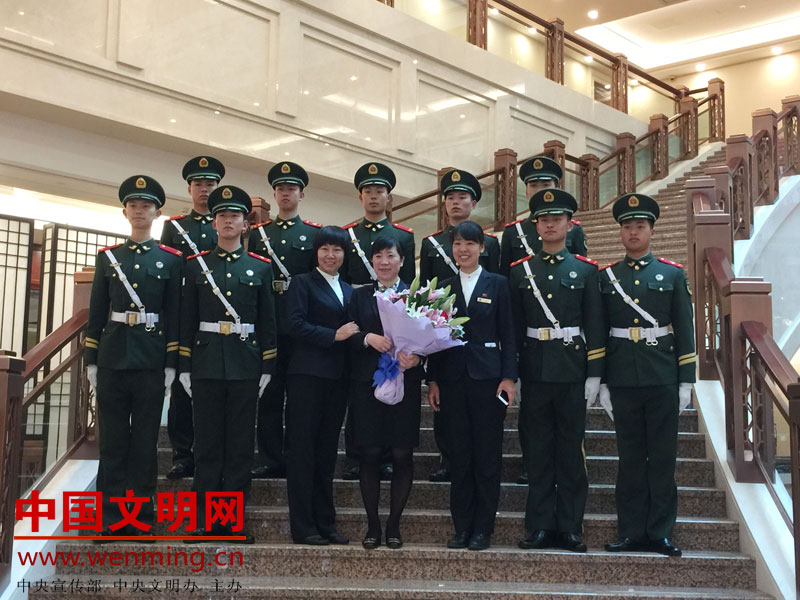 3月8日上午,全国两会代表团驻地的武警官兵为女性工作人员献花。(中国文明网 胡杨 摄)