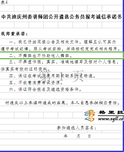 附件: 1.中共迪庆州委讲师团公开遴选公务员报名表 2.中共迪庆州委讲师团公开遴选公务员单位同意报考证明 3.中共迪庆州委讲师团公开遴选公务员工作经历证明 4.中共迪庆州委讲师团公开遴选公务员报考诚信承诺书 5. 中共迪庆州委讲师团公开遴选公务员经历业绩评价信息采集表 6.个人自传表