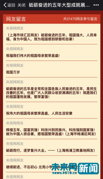 “砥砺奋进的五年”大型成就展网上展馆留言页面。 “中国发生了翻天覆地的变化,也正因为这些变化,我们开始越来越自信,也更加热爱这个让我们挺起脊梁的国家! ” “在党的领导下我们的国家越来越富强我们的生活水平越来越高祝愿我们的祖国繁荣昌盛。” “砥砺奋进的五年,日新月异的五年,愿祖国发展越来越好,人民生活越来越富足。” “期待十九大,总结成果,展规未来!中华民族的伟大复兴必将实现,我为中国自豪,我为中国骄傲。” …… 记者了解到,截至目前,“砥砺奋进的五年”大型成就展累计参观者突破40万人次,网上展馆也已经有超过2万位网友留言互动,说出自己的观展心声。 |