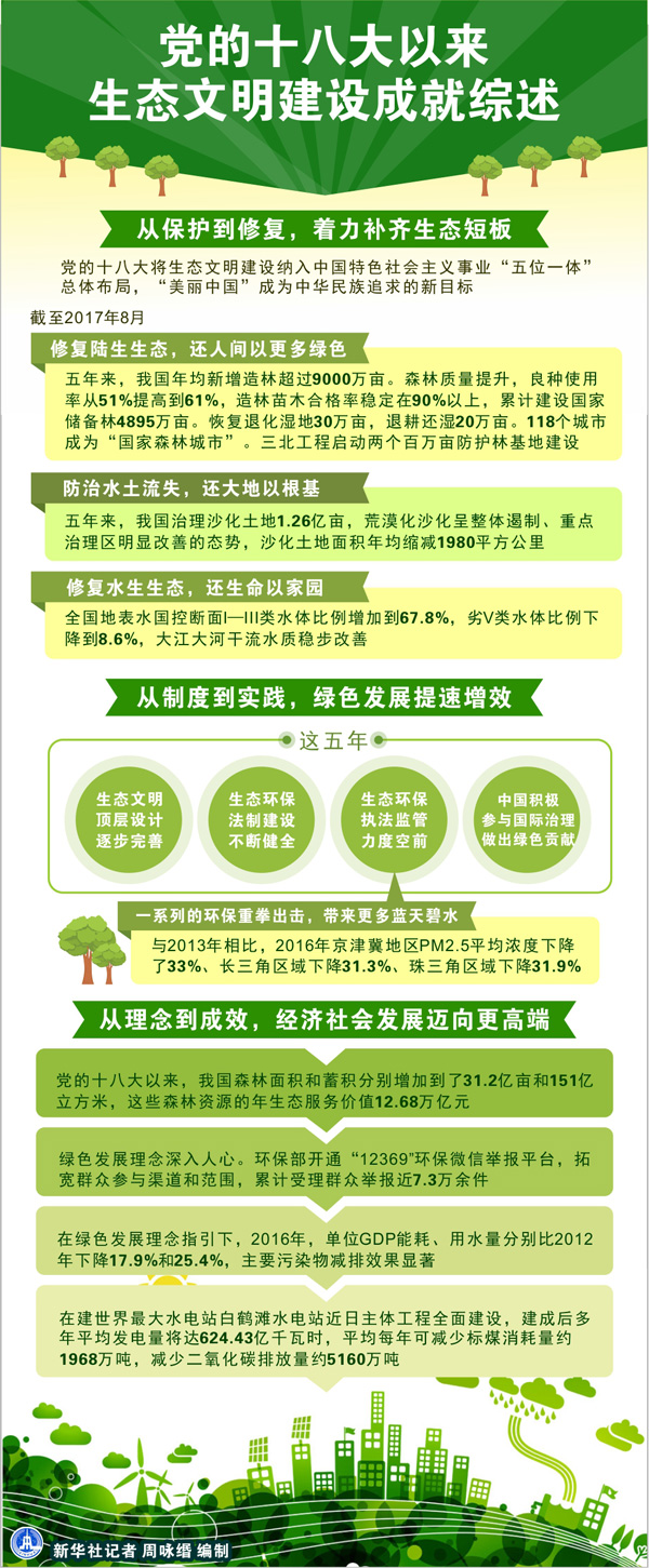 守护幸福,承载梦想,美丽中国新图景,正在中华大地徐徐展开。 党的十八大以来,在以习近平同志为核心的党中央领导下,绿色发展、绿色生活理念深入人心,中国经济社会发展更加充满活力,生态文明建设推动中华民族在伟大复兴征程中阔步前进。 ![]() 生态兴则文明兴,生态衰则文明衰。着眼中华民族永续发展,开创生态文明建设新局面 2017年7月7日,波兰克拉科夫,第41届世界遗产委员会会议上,可可西里跻身世界自然遗产。 为保护生态极其重要又极为脆弱的可可西里,2015年12月,中央全面深化改革领导小组第十九次会议审议通过了三江源国家公园体制试点方案。包括可可西里在内的三江源地区,成为我国首个国家公园试点。 国家公园这种新的保护形式,将使三江源成为青藏高原生态保护修复示范区,成为共建共享、人与自然和谐共生的先行区。 党的十八大以来,以习近平同志为核心的党中央提出一系列新理念新思想新战略,回答了为什么建设生态文明、怎样建设生态文明等重大问题,形成了科学系统的生态文明建设理论体系。 党的十八大报告将生态文明建设纳入中国特色社会主义事业“五位一体”总体布局,首次把“美丽中国”确立为生态文明建设的宏伟目标。 “我们追求人与自然的和谐、经济与社会的和谐,通俗地讲就是要‘两座山’:既要金山银山,又要绿水青山,绿水青山就是金山银山。”2013年9月7日,习近平总书记在哈萨克斯坦纳扎尔巴耶夫大学发表演讲后回答学生提问时说,“我们绝不能以牺牲生态环境为代价换取经济的一时发展。” 5年来,生态文明建设具有顶层设计意义的一系列“四梁八柱”日益完善——中央审议通过40多项生态文明和环境保护具体改革方案,各地结合实际推出实施办法,生态文明建设的制度日臻完善。 2015年4月,中共中央、国务院印发《关于加快推进生态文明建设的意见》,明确了生态文明建设的总体要求、目标愿景、重点任务、制度体系。 同年9月,《生态文明体制改革总体方案》出台,提出到2020年,构建起由自然资源资产产权制度、国土空间开发保护制度、资源有偿使用和生态补偿制度、环境治理体系、生态文明绩效评价考核和责任追究制度等8项制度构成的产权清晰、多元参与、激励约束并重、系统完整的生态文明制度体系。生态文明建设有了更加明晰的“路线图”。 5年来,生态文明建设的基础性制度逐步完善,扎紧了制度的篱笆。生态文明建设目标评价考核办法、全面推行河长制、生态环境损害赔偿制度改革试点、党政领导干部生态环境损害责任追究办法等相继出台,生态文明建设的责任主体更加明确。 5年来,生态文明建设的法律体系不断健全完善。新修订实施的环境保护法,确立了按日连续计罚等惩罚措施,被称为“史上最严”环保法;修改大气污染防治法、水污染防治法、环境影响评价法等环境保护的有关法律,加大惩罚力度,提高违法成本…… 中央党校教授辛鸣认为,“绿水青山就是金山银山”这一重要论断,确立了生态环境在生产力构成中的基础地位,丰富和发展了马克思主义生产力发展思想。 环境就是民生,青山就是美丽,蓝天也是幸福。五年来,我国生态文明建设力度更大、举措更实、推进更快、成效更好 2017年初,河北省文安县鹏程木业老板郭万立做出了一个决定:把在廊坊的别墅卖掉,凑了近3000万元,给企业新上了环保设备,走清洁生产的提档升级之路。 文安地处河北省廊坊市,是我国最大的胶合板生产基地之一,最多时有企业8000多家,从业人员10万。大小企业和家庭作坊遍地开花,但有污染治理设施的却没有几家。 今年4月起,环保部对大气污染较为严重的京津冀及周边地区的城市开展为期一年的环保强化督察。像这样的“散乱污”企业正是督查的重中之重。 17.6万家——这是28个城市排查出需要整治的“散乱污”企业数量。对于这些企业而言,如果不能实现达标排放,唯一的选择将是关停。 断腕才能重生。为了换回蓝天,以牺牲环境为代价的落后的生产方式已经不可持续。转型升级难免会有阵痛,但走一条更加环境友好的发展之路是必由选择。 文安县下大力气鼓励企业进行兼并重组,转型升级。全县企业共投入12亿元资金进行技术改造。如今,整合升级后的200家企业全部达标,产值、纳税均实现翻番。 这仅仅是十八大以来,我国向污染宣战的一个缩影。 从2013年起,我国打响了大气、水、土壤污染防治的“三大战役”,《大气污染防治行动计划》《水污染防治行动计划》《土壤污染防治行动计划》陆续出台,向污染宣战迈出了更加坚实的步伐。 与2013年相比,2016年京津冀地区PM2.5平均浓度下降了33%、长三角区域下降31.3%、珠三角区域下降31.9%;全国酸雨区面积占比已从历史高期的30%以上下降到当前7%左右的水平。 全国地表水国控断面I-III类水体比例增加到67.8%,劣V类水体比例下降到8.6%,大江大河干流水质稳步改善。 领导干部是推进生态文明建设的关键少数。5年来,我国通过各项制度的落地,逐渐将各级领导干部的生态环保责任压实。 2015年底,中央环保督察巡视从河北省开始试水。到今年9月,第四批中央环境保护督察组已完成对吉林、浙江、山东、海南、四川、西藏、青海、新疆(含兵团)等省(区)的督察进驻。我国实现对31个省份的中央环保督察全覆盖。 中央环保督察组每到一处,都掀起了