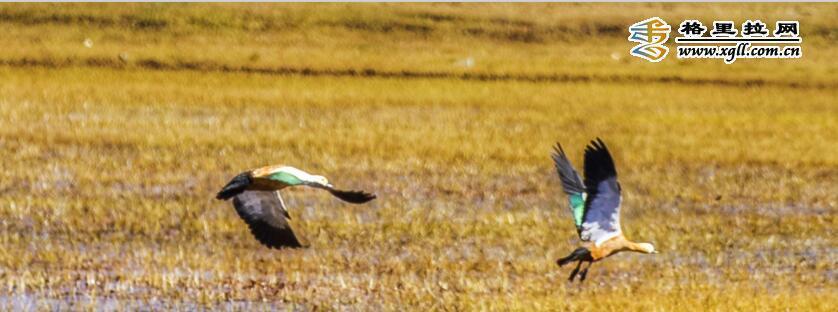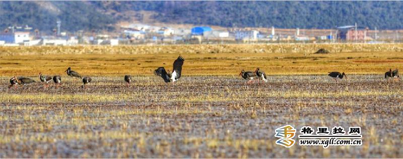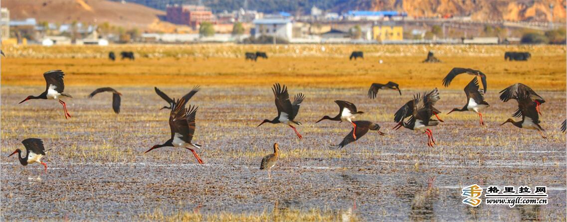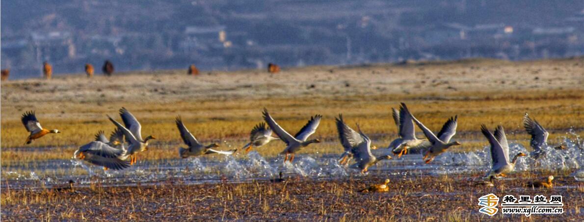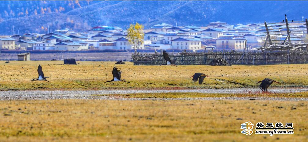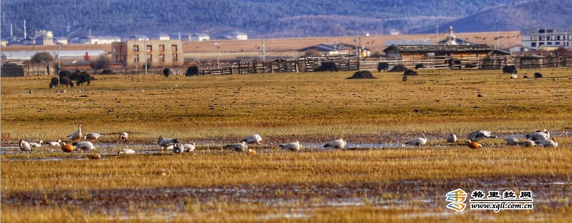 纳帕海由于特殊的地理区位和季节性特点,成为了横断山中一座重要的鸟类驿站。图中,湖边隐约的村落民居和湖中栖息的鸟儿们共同入镜,这里是人与鸟共有的美丽家园。(松学宝 摄)
