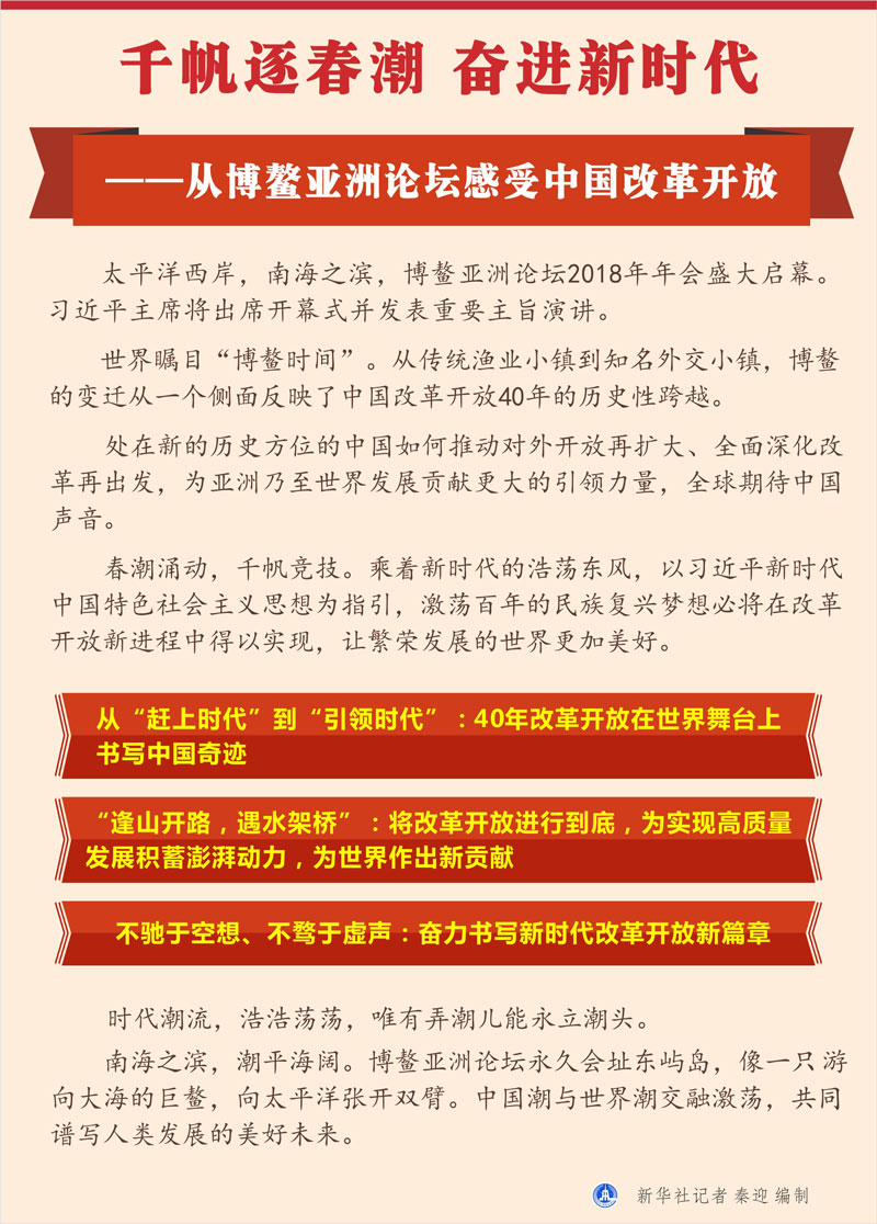 新华社海南博鳌4月9日电 题:千帆逐春潮奋进新时代——从博鳌亚洲论坛感受中国改革开放 新华社记者韩洁、谭谟晓、赵叶苹 太平洋西岸,南海之滨,博鳌亚洲论坛2018年年会盛大启幕。习近平主席将出席开幕式并发表重要主旨演讲。 世界瞩目“博鳌时间”。从传统渔业小镇到知名外交小镇,博鳌的变迁从一个侧面反映了中国改革开放40年的历史性跨越。 处在新的历史方位的中国如何推动对外开放再扩大、全面深化改革再出发,为亚洲乃至世界发展贡献更大的引领力量,全球期待中国声音。 春潮涌动,千帆竞技。乘着新时代的浩荡东风,以习近平新时代中国特色社会主义思想为指引,激荡百年的民族复兴梦想必将在改革开放新进程中得以实现,让繁荣发展的世界更加美好。