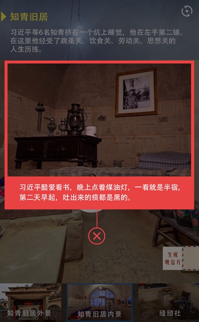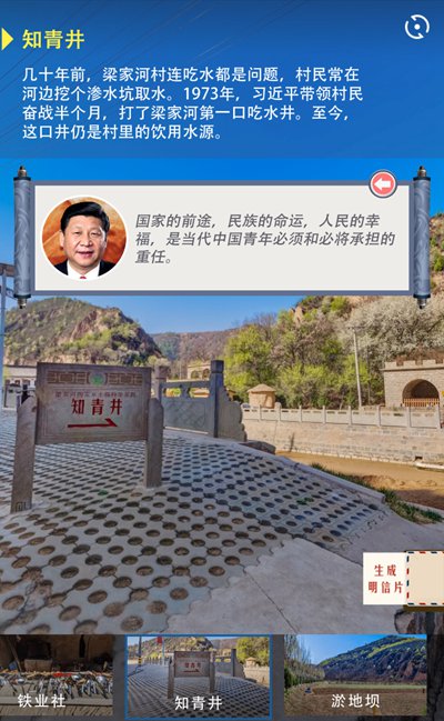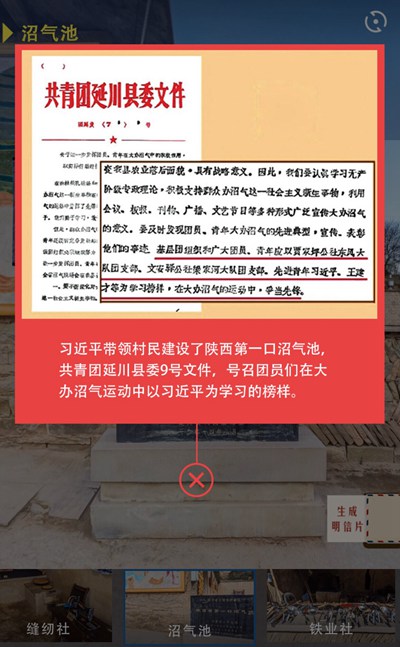 除了故事的细节,读者在H5中看到的每张图片也都是经过精挑细选、反复比照过的。在“陕西省第一口沼气池”的纪念碑前,点击红色marker,这张“共青团延川县委号召团员在大办沼气运动中学习习近平”的图片,就是我们翻阅《习近平的七年知青岁月》找到的,司格指着图片说。 党的十九大以来,共青团中央发出通知,部署全团开展“青年大学习”行动,把深入学习宣传贯彻习近平新时代中国特色社会主义思想和党的十九大精神作为首要政治任务和核心业务,通过构建“导学、讲学、研学、比学、践学、督学”六位一体的学习体系,推动习近平新时代中国特色社会主义思想在青年中入耳入心,引导广大青年不忘初心、牢记使命,切实增强“四个意识”、树立“四个自信”,更加紧密地团结在以习近平同志为核心的党中央周围,坚定不移听党话、跟党走。 “我们之前学习《习近平的七年知青岁月》、学习习近平新时代中国特色社会主义思想等,都是从总书记对青年、团干部要求的角度来看的,很少从总书记自己的人生经历这个角度去汲取力量。”团中央宣传部的工作人员也全程参与了此次VR全景的制作,其中一名工作人员觉得,单纯的书本学习,并不容易引起青年思想上的共鸣。 通过展示青年习近平的实际行动来影响和带动当今青年、告诉他们“青春是用来奋斗的”,比单纯的书本、宣讲更有效果。同样是青年人,这位工作人员希望,作品在创作中能够更多站在青年人角度去呈现。 “总书记过去受的苦可能超过现在年轻人想象的范畴,我们希望通过现场图景的展示给青年带来更直观的感受。之后再来对照总书记对青年的要求,就能够更深刻地体会总书记对青年的关怀。”他举了个例子,很多人都知道总书记在煤油灯下看书的故事,但是现在的青年或许并不知道什么是煤油灯,也不了解一盏煤油灯的亮度能达到什么程度。“用青年喜爱的VR呈现,不仅形象,也容易引起大家关注。”