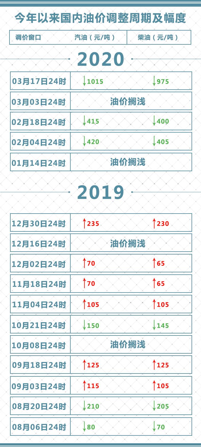 年内油价变动一览:三跌两搁浅 2020年,国内成品油调价已呈现“三跌两搁浅”的格局。截至3月17日,今年共有5次调价窗口期,其中2月4日、2月18日、3月17日国内成品油价格下调。截至本次调价,汽油价格累计每吨下调1850元,柴油价格累计每吨下调1780元。1月14日和3月3日两次窗口期对应的前10个工作日国际油价有涨有跌,平均水平变化不大,国内成品油调价金额每吨不足50元,价格未作调整,未调部分已分别纳入2月4日和3月17日调价金额。(来源:云南网) |