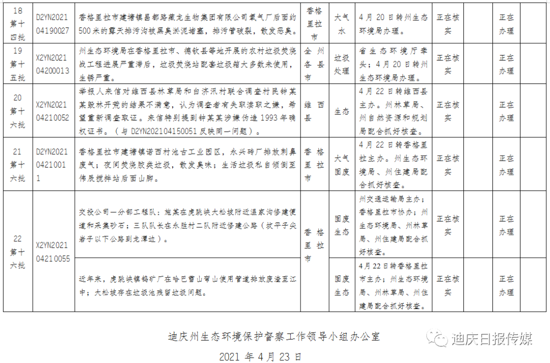 迪庆州生态环境保护督察工作领导小组办公室第一时间将督察组交办的交办件转相关县(市)及部门进行办理;及时公开中央第八生态环境保护督察组交办的群众举报投诉生态环境问题的受理、办理和整改情况。可登录迪庆藏族自治州人民政府网站http://www.diqing.gov.cn/xxgk/list/查阅群众信访举报转办和边督边改公开情况一览表。 根据安排,中央第八生态环境保护督察组督察进驻云南时间为1个月。进驻期间(2021年4月6日—5月6日)设立专门值班电话:0871—68599800,专门邮政信箱:云南省昆明市A005号邮政信箱。督察组受理举报电话时间为每天8:00—20:00。 中央生态环境保护督察群众信访举报转办和边督边改公开情况一览表 截止2021年4月23日,云南省迎接中央生态环境保护督察工作领导小组边督边改组交办中央第八生态环境保护督察组(以下简称“督察组”)涉及迪庆州群众举报投诉生态环境问题共22件(来电8件、来信14件),涉及香格里拉市12件、维西县3件、州级部门7件。