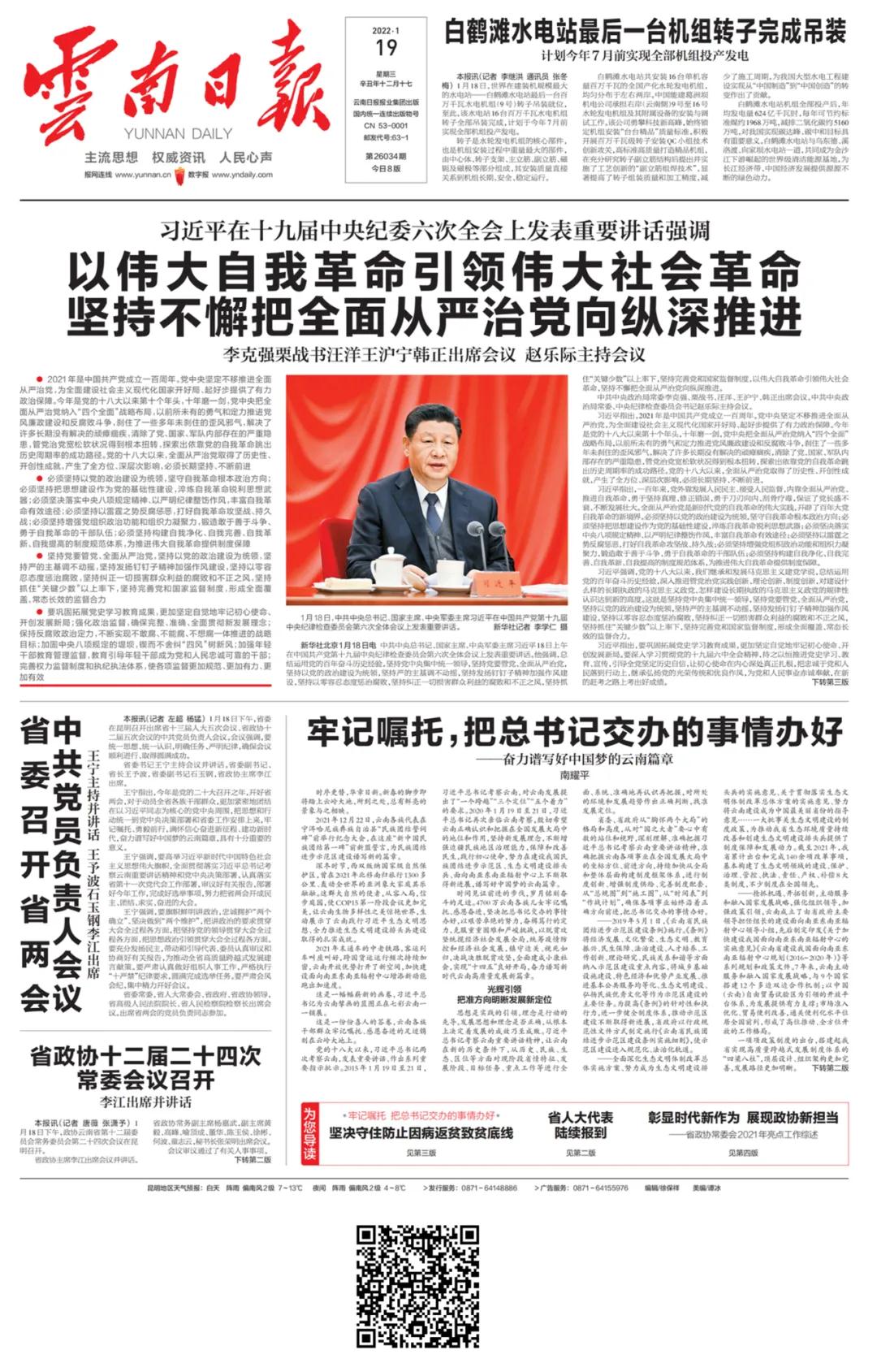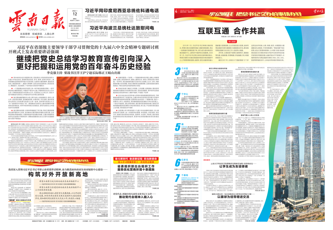 党的十八大以来,习近平总书记两次考察云南并发表重要讲话,为云南确定了新坐标、明确了新定位、赋予了新使命。习近平总书记考察云南重要讲话是推动云南经济社会发展的“纲”和“魂”,是云南发展的根本遵循。7年来,省委、省政府团结带领全省各族干部群众牢记嘱托,主动服务和融入国家发展战略,闯出了一条高质量发展的路子。 2022年1月10日起,《云南日报》推出“牢记嘱托,把总书记交办的事情办好”专栏和特刊,全方位回顾省委、省政府带领全省广大干部群众,牢记嘱托,把习近平总书记交办的事情办好,走过的奋进历程、取得的新成就、展现的新气象,激励全省各族人民坚定沿着习近平总书记指引的方向阔步前进,全面建设社会主义现代化,奋力谱写好中国梦的云南新篇章。 如何把总书记交办的事情办好? 1月10日至19日 《云南日报》连续10天刊发系列文章 ↑点击版面图查看全文内容 希望云南努力成为民族团结进步示范区 ——习近平总书记2015年1月19日至21日在云南考察时强调 希望云南努力在建设我国民族团结进步示范区上不断取得新进展 ——习近平总书记2020年1月19日至21日在云南考察时指出 “把云南建设成为我国民族团结进步示范区”是以习近平同志为核心的党中央着眼全国民族团结进步事业大局和云南突出特点作出的重要部署,也是习近平总书记对云南的殷殷嘱托。 多年来,省委、省政府牢牢守好民族团结这条“生命线”,始终把民族工作摆在全省工作大局的突出位置,把民族团结进步示范区建设作为全省经济社会发展的重大定位,一以贯之、大力推进,少数民族群众生活和民族地区经济社会发展获得前所未有的进步,边疆民族地区治理能力显著提升,中华民族共同体意识不断增强,谱写了新时代民族团结进步事业发展的新篇章。 ↑点击版面图查看全文内容 希望云南努力成为生态文明建设排头兵 要把生态环境保护放在更加突出位置,像保护眼睛一样保护生态环境,像对待生命一样对待生态环境 ——习近平总书记2015年1月19日至21日在云南考察时指出 希望云南努力在建设生态文明建设排头兵上不断取得新进展 ——习近平总书记2020年1月19日至21日在云南考察时指出 2015年1月,习近平总书记考察云南,对云南提出了“努力成为生态文明建设排头兵”的战略定位。2020年1月,习近平总书记再次考察云南,要求云南努力在建设我国生态文明建设排头兵上不断取得新进展。 生态兴则文明兴。省委、省政府深入贯彻落实习近平生态文明思想,牢固树立绿水青山就是金山银山的理念,以更高标准、更严要求推进生态文明建设,守护好七彩云南的蓝天白云、绿水青山、良田沃土。 ↑点击版面图查看全文内容 希望云南努力成为面向南亚东南亚辐射中心 ——习近平总书记2015年1月19日至21日在云南考察时指出 希望云南努力在建设面向南亚东南亚辐射中心上不断取得新进展 要主动服务和融入国家重大发展战略,以大开放促进大发展,加快同周边国家互联互通国际大通道建设步伐。要加强同周边国家文化交流工作,促进民心相通 ——习近平总书记2020年1月19日至21日在云南考察时指出 建设我国面向南亚东南亚辐射中心,是以习近平同志为核心的党中央赋予云南的历史使命和政治责任,也是云南省推动高质量跨越式发展的重大机遇和重要平台。 看清大势、把准脉搏,在“硬联通”“软联通”“心联通”上发力,击鼓催征,云南全力构筑对外开放新高地。 牢记习近平总书记殷殷嘱托,坚定不移沿着习近平总书记指引的方向前行。7年来,云南持续推进面向南亚东南亚辐射中心建设,奋力开创新局面。 ↑点击版面图查看全文内容 全面实现小康,一个民族都不能少 ——习近平总书记2015年1月19日至21日在云南考察时指出 要坚持以人民为中心的发展思想,全面落实党中央各项惠民政策,抓住人民群众最关心最直接最现实的利益问题,全力做好普惠性、基础性、兜底性民生建设,让各族群众有更多获得感、幸福感、安全感 ——习近平总书记2020年1月19日至21日在云南考察时指出 彻底摆脱贫困,全面建成小康社会,是中华民族的千年梦想。党的十八大以来,在以习近平同志为核心的党中央的正确领导下,省委、省政府团结带领各族群众持续奋斗,深入贯彻落实习近平总书记考察云南重要讲话和重要指示批示精神,决战决胜脱贫攻坚,如期完成脱贫攻坚任务,困扰云南千百年的绝对贫困问题得到历史性解决。云南各族人民牢记习近平总书记殷殷嘱托,自觉践行新发展理念,团结拼搏、克难奋进,各项事业取得了前所未有的新成就,书写了全面建成小康社会的辉煌篇章。 ↑点击版面图查看全文内容 在推动产业优化升级上下功夫 ——习近平总书记2015年1月19日至21日在云南考察时指出 加快发展新兴产业 ——习近平总书记2020年1月19日至21日在云南考察时指出 推动产业转型升级,加快产业结构由中低端向中高端迈进,是习近平总书记对云南的殷殷嘱托,也是云南实现高质量跨越式发展的必由之路。 产业兴则经济兴,产业强则经济强。7年来,云南坚定不移沿着习近平总书记指引的方向前行,调结构、兴产业、谋发展,加快构建现代化产业体系,持续拓展产业发展新空间,云南独特的区位优势、资源优势、开放优势正转化为强大的发展动能。 ↑点击版面图查看全文内容 加快基础设施