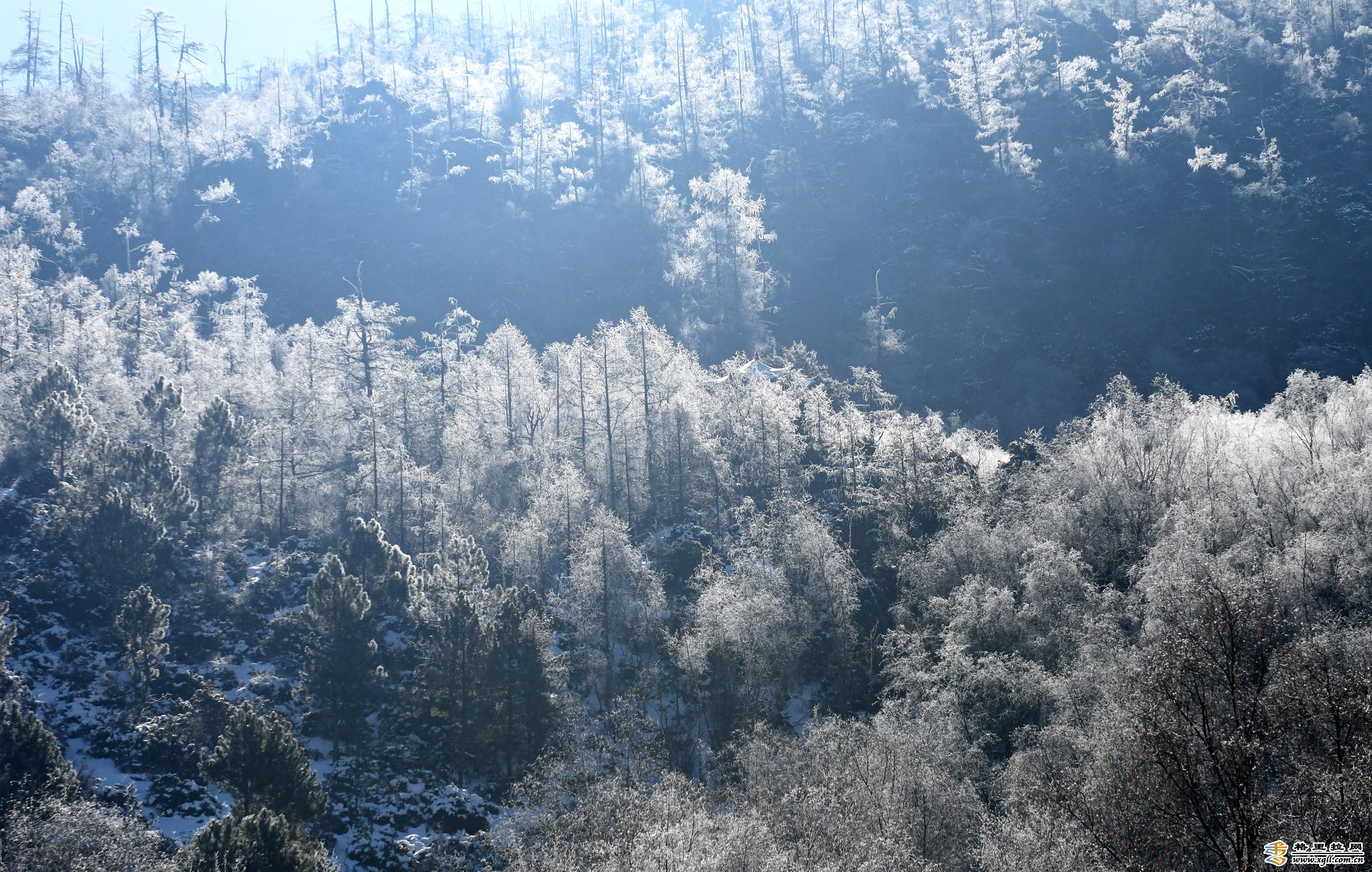 日,香格里拉市五凤山出现雾凇景观。早晨,在暖阳照射下,整山晶莹剔透,美丽无比。