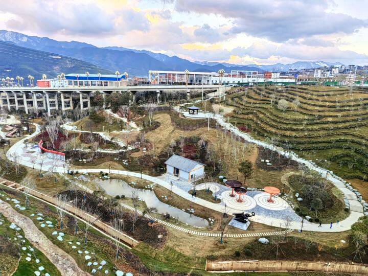 俯瞰维西县新建的瀑布公园。近年来,维西县夯实基础补齐短板,市政基础设施不断完善,新建一批公园,为市民提供了更多的绿色活动空间。(张燕 摄)