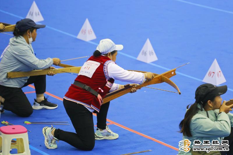 赛场上的余学兰一身红色的傈僳族服装,脸上洋溢着淳朴的笑容,格外显眼。几天来,她在民族传统弩项目中获得了女子立姿比赛的银牌和女子个人全能赛铜牌,在民族传统弩女子立姿比赛决赛中,更是以稳定的10环成绩一箭反超对手。“来到大的赛场了才知道民间的高手很多,有时候因紧张影响了发挥,在家里20支箭我能射到194环,赛场上比在家里练习时候的成绩差一些。”余学兰说。 “平时,我每天中午1点练一次,下午5点练习一次,每天射弩的两小时是我最开心的时候。”余学兰说道,自己家在维西县保和镇永宁社区康恩家园,平时有一份社区保洁的工作,休息时间她就会研究射弩技巧。余学兰的老公则是村里有名的制弩手艺人,从小就精通制作弩,时常有人向他定制弓弩,他也是余学兰的射弩启蒙老师,两人时常在家里切磋弩艺。“我的弩和箭都是我老公做的,一支箭在市场上卖40元、50元,我们自己做省了很多钱。”余学兰说。