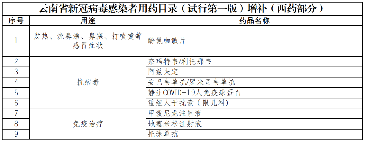 根据目前云南省新冠病毒感染者用药情况,省卫生健康委组织药学、临床和中医等专家进一步论证梳理,对《云南省新冠病毒感染者用药目录(试行第一版)》进行增补。针对发热、咳嗽等症状增补了14个中成药、37个医院中药制剂和1个西药,患者可根据自身症状需求,从医院、零售药店和电商平台等多种渠道获得,根据医嘱和药品说明书合理使用;针对抗病毒和免疫治疗等用途增补了8类西药,各医疗机构根据患者病情,结合《新型冠状病毒肺炎诊疗方案(试行第九版)》使用。