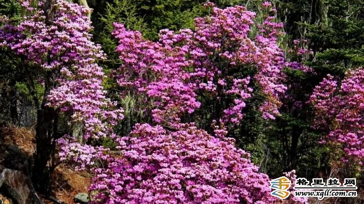 一树树粉嫩、紫红色的杜鹃花装点着山林