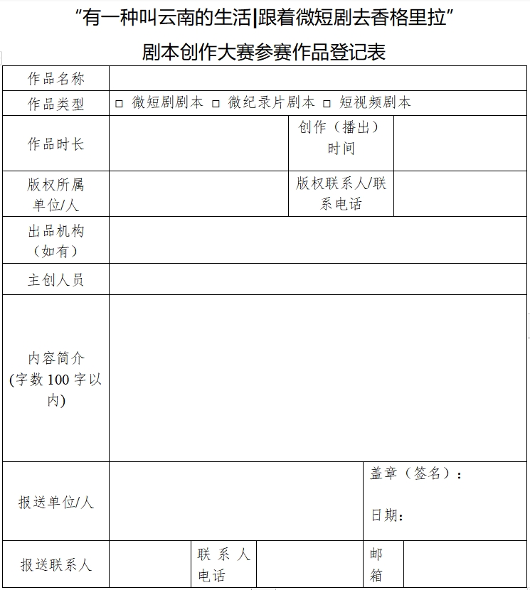 《我的阿勒泰》《去有风的地方》、《狂飙》、《繁花》、《与凤行》...... 你是否看过这些剧啊 一部影视作品“带火”一座城 如果你也有拍剧的梦想 那么 就是现在 让你施展才华 绽放光芒的舞台来啦 为积极融入“微短剧+文旅”新赛道,让更多人深度参与香格里拉包容多样的民族宗教文化内涵解读,不断扩大香格里拉品牌的知名度和影响力,以微短剧引流赋能世界级旅游目的地,经迪庆香格里拉短剧创作大赛筹备领导小组研究,决定在微短剧创作大赛前期组织开展“有一种叫云南的生活|跟着微短剧去香格里拉”剧本创作大赛。 如果你想参赛,想拿奖 以下内容全是重点 本次大赛围绕“有一种叫云南的生活|跟着微短剧去香格里拉”主题,聚焦庆祝新中国成立75周年,以剧本创作大赛呈现、展示和传播“香格里拉”“三江并流”“茶马古道”“虎跳峡高路”“日照金山”“人生第一座雪山”“松赞林寺”等多张自带IP的世界级品牌,迪庆多民族融合发展、多宗教和谐并存、多元地形地质地貌、生物多样性等资源优势,以不同的视角记录雪域高原的巨变、讴歌时代的跨越发展,在推进农文旅深度融合发展,推动迪庆成为世界级旅游目的地、激励各族群众投身中国式现代化迪庆实践中发挥作用。 参赛对象 个人或单位均可参赛,不限年龄、身份、学历,鼓励在校学生踊跃投稿。 大赛组织 1.赛制:采用初审、终审二级赛制,赛事流程包括启动、征集、初审、终审、颁奖共5个环节。 2.评委:大赛初审评委不少于8人,负责参赛作品的价值观、合法性等初步审查,终审评委不少于5人,主要由剧本行业专家组成。 3.作品要求:参赛作品必须坚持正确政治方向、舆论导向、价值取向,传递社会主义核心价值观,使用国家通用语言文字,内容必须包含迪庆元素,如:讲述迪庆故事、迪庆民族宗教文化、迪庆历史、迪庆地形地质地貌、迪庆生物多样性、迪庆产业发展或者沪滇帮扶迪庆20年故事等等,可以在迪庆文史资料、神话故事、真实事件以及迪庆籍学者撰写的小说、诗歌、散文、科普读物、专业书籍等基础上进行改编,也可以进行自由创作,其中,2000字以内为短视频剧本,2000-10000字为微短剧剧本/微纪录片剧本。 时间安排 1.大赛启动:2024年5月21日,由州广播电视局、团州委发文作出部署,省、州以及沪滇协作区相关媒体进行整体宣传报道。 2.作品征集:2024年5月21日至6月26日,申报机构或个人应在征集截止日期之前,填报相关信息并报送作品。 3.作品初评及终评:2024年7月9日前,由专家评审组对参赛入围作品进行初评、终评,按照作品最终得分及专家终评评议意见,经领导小组会议研究,2024年7月10日公布大赛获奖作品。 4.颁奖仪式:在“有一种叫云南的生活|跟着微短剧去香格里拉”微短剧大赛颁奖盛典中设置剧本单元,为获奖作品颁发奖杯、证书以及奖金、奖品。 奖项设置 “有一种叫云南的生活|跟着微短剧去香格里拉”剧本创作大赛按短视频剧本、微短剧剧本、微纪录片剧本3个单元分别设一、二、三等奖和入围奖,所有获奖作品由主办单位通报表扬,邀请专家评委现场点评,邀请州级领导颁发证书,并给予适当奖金奖励。 微短剧剧本单元一等奖1部(每部奖金50000元),二等奖3部(每部奖金20000元),三等奖10部(每部奖金5000元),入围奖20部(每部给予奖金1000元或同等价值迪庆青创产品礼盒奖励)。 微纪录片剧本单元一等奖1部(每部奖金30000元),二等奖3部(每部奖金10000元),三等奖10部(每部奖金3000元),入围奖20部(每部给予奖金1000元或同等价值迪庆青创产品礼盒奖励)。 短视频剧本单元一等奖1部(每部奖金5000元),二等奖3部(每部奖金2000元),三等奖10部(每部奖金1000元),入围奖20部(每部给予奖金500元或同等价值迪庆青创产品礼盒奖励)。 另外,活动主办方还将在获奖作品中选择部分作品推荐投资拍摄短视频、微短剧或微纪录片,推荐参加“有一种叫云南的生活|跟着微短剧去香格里拉”微短剧创作大赛。 大赛须知 1.参赛者应确认拥有其作品的完整著作权,主办方不承担因肖像权、名誉权、隐私权等纠纷而产生的法律责任,因此给主办方造成的经济损失,主办方有权要求参赛者承担。 2.所有参赛作品必须是原创,改编自同名小说的请务必注明,不得侵犯他人知识产权。如发生版权纠纷,责任由报送单位或个人自负,获得奖项予以撤销,奖金予以追回。 3.参赛者投稿时,应如实填写报名材料,提供真实准确的个人信息及联系方式。提供信息不完整、不真实的,主办方将取消其参评资格。 4.以团队形式参赛的,作者限10人以内。团队作品应指定一名主创成员报名,不得重复报送。 5.参评方同意授权主办方以非盈利目的在相关媒体及网络平台上择优展播作品、投拍短视频、微短剧、微纪录片。活动主办单位对参赛作品拥有使用及推广权,有权将参赛作品在媒体平台上展播,并择优推荐申报国家广播电视总局、云南省广播电视局等相关扶持项目及推优评奖活动。 6.本次大赛不收取任何费用,概不退稿。凡参赛者报名成功,均视为已确认并遵守本通知的各项规定。 作品报送 本次大赛参赛作品报送时间为发布之日至2024年6月25日24时截止,逾期报送无效。作品可通过线上或线下进行报送。 ①线上报送:将参赛作品及加盖公章或签字的报名材料扫描件(签字仅限个人或团队作品报送)发送至赛事官方指定邮箱:dqzgbdst@16