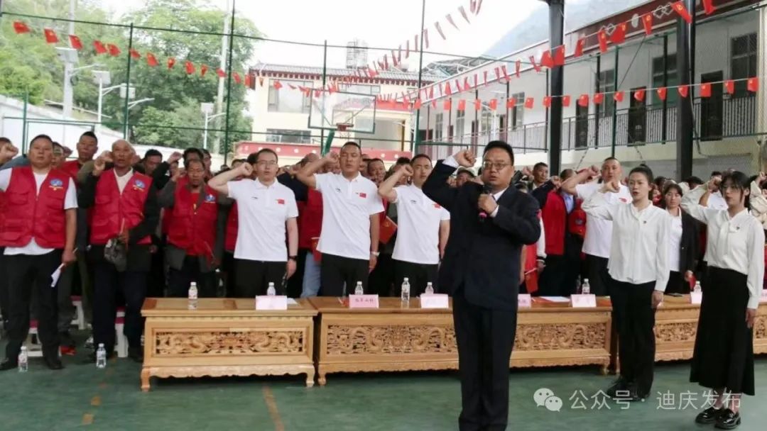 共同重温入党誓词,聆听党员代表作国旗下的演讲,回顾党的光辉历程,弘扬伟大建党精神,进一步激发基层党组织活力,增强广大党员的光荣感、使命感。 维西县举行“七一”升国旗仪式 7月1日,维西县在行政中心广场举行庆“七一”升国旗仪式,庆祝中国共产党成立103周年。升旗仪式上,由县公安民警组成的护旗队踏着整齐的步伐走到国旗台前,在激昂雄壮的国歌声中,鲜艳的五星红旗冉冉升起,在场的党员干部表情庄重而严肃,面向飘扬的五星红旗行注目礼,共同表达对党、对祖国的忠诚和热爱。 随后,全体党员面对党旗,举起右拳,重温入党誓词。铮铮誓言表达了对党的忠诚、为共产主义事业奋斗终身的决心。当天,全体在家四套班子领导,县直各部门主要负责同志、机关党员干部代表500余人参加升国旗仪式。 德钦县举行“七一”升国旗仪式 7月1日,德钦县在行政中心广场举行庆“七一”升国旗仪式,庆祝中国共产党成立103周年,近千名干部职工参加升国旗仪式。 活动对在党50周年的老党员颁发了荣誉奖章,全体党员重温了入党誓词,当天,还举行了新党员入党仪式。据悉,德钦县当天共有125人光荣的加入了中国共产党。 丰富多彩的"七一"主题活动 香格里拉市建塘镇金龙社区