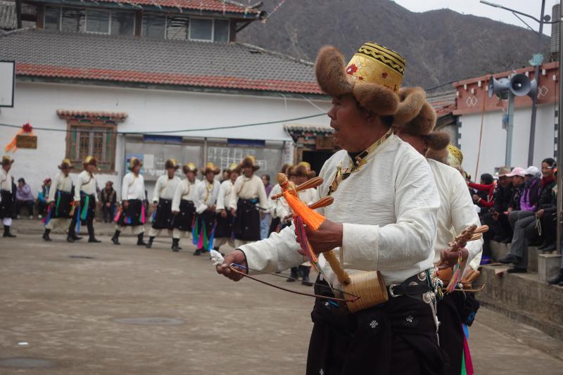 弦子舞在藏语里称为“仁”(藏语,意为载歌载舞),跳弦子舞则统称为“仁羌”,其是一种优美、抒情的自乐性歌舞。在节庆、婚嫁、聚会时,人们会欢聚一堂,跳弦子舞,男拉弦子(又称“马尾琴”,藏语称“兵永”),女舞长袖;男唱女应,女唱男答;男女各半,围圈起舞。