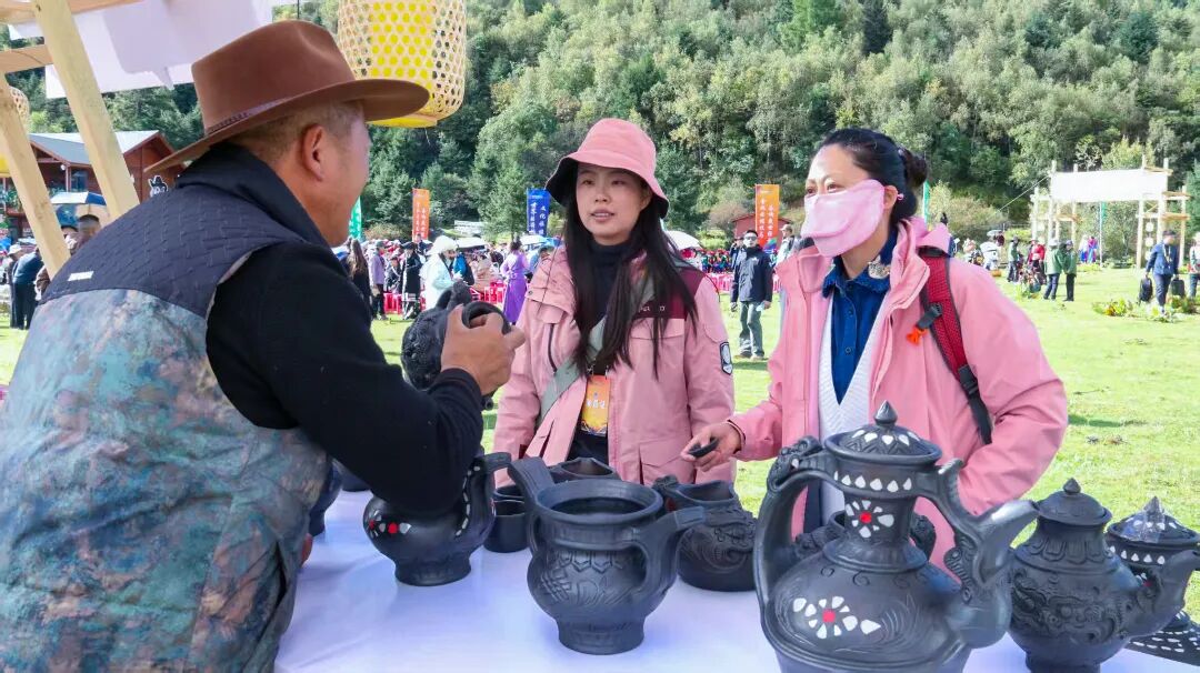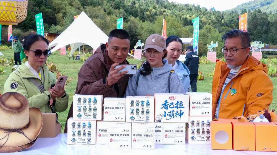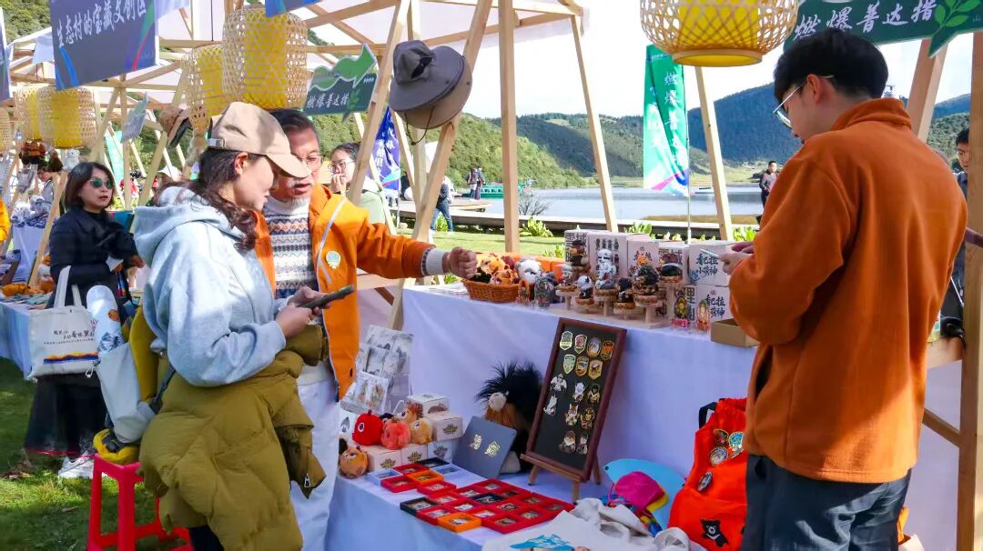 11时许,文艺表演环节落幕。嘉宾们有序参观属都湖创意生活市集,“指尖传承”工作坊里,唐卡画师指导游客绘制吉祥图案;“万物有灵”DIY区,孩子们用松果、树叶创作生态艺术品;“生态村的宝藏”展台上,憨态可掬的IP形象“松鼠扎西”系列文创引发抢购热潮。特别设立的“山海大集”汇聚云南各地特色产品,成为现场最热闹的网红打卡点,让大家近距离感受民族手工艺品与特色美食的魅力。